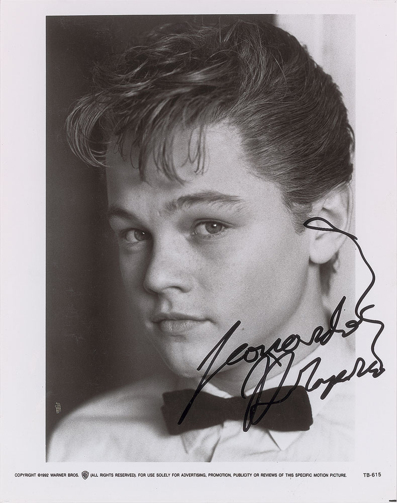 Wonderful glossy 8 x 10 Warner Brothers publicity photo of a young DiCaprio, signed in black felt tip. In fine condition. Pre-certified PSA/DNA. From the Harvey and Rhoda Kuflik Collection.