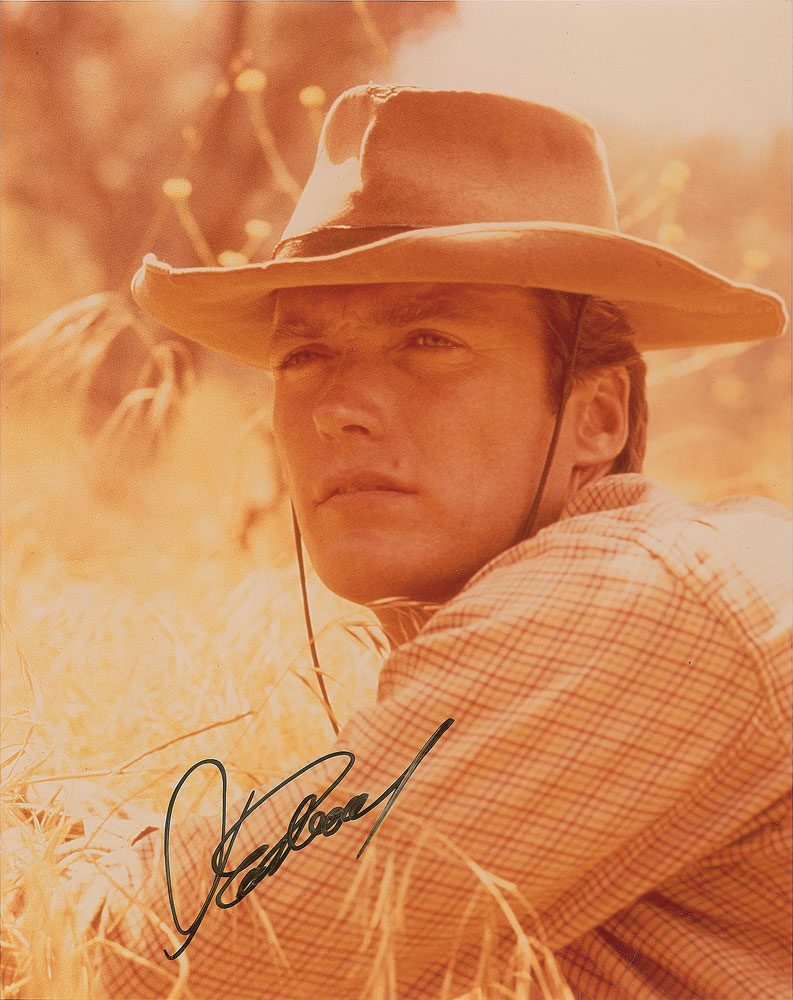 Attractive color glossy 8 x 10 photo of Eastwood as Rowdy Yates from the classic television series Rawhide, signed in black felt tip. In very fine condition. Pre-certified PSA/DNA. From the Harvey and Rhoda Kuflik Collection.