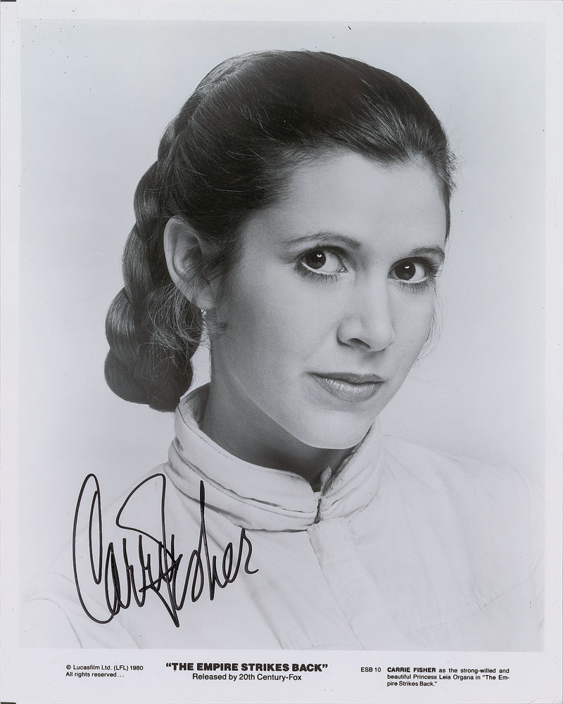 Highly desirable glossy 8 x 10 20th Century-Fox publicity close-up photo of Fisher as Princess Leia from the epic 1980 film Star Wars: Episode V—The Empire Strikes Back, signed in black felt tip. In fine condition. Pre-certified PSA/DNA. From the Harvey and Rhoda Kuflik Collection.