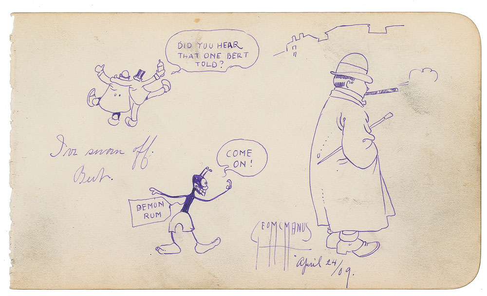 Series of small original ink sketches on an off-white 6.75 x 4 album page, signed below in purple ink, “Geo. McManus, April 24/09.” Sketches include two drunk men walking, the man with a bottle saying, “Did you hear that one Bert told?,” with McManus adding below, “I’ve sworn off. Bert.” Also features a creature with a tag that reads, “Demon Rum,” and saying “Come on!,” as well as a man in a trench coat smoking below an outline of houses. In fine condition, with light soiling to the edges. Pre-certified PSA/DNA.