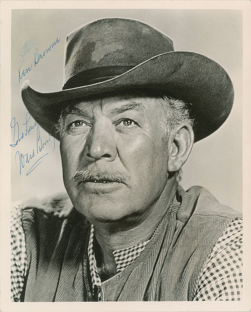 Character actor (1903-1960) remembered for his roles in Wagon Train, It's a Wonderful Life, and The Searchers. Vintage matte-finish 8 x 10 photo of Bond in the classic Wagon Train television series, signed and inscribed in blue ballpoint, "To Ken Browne, Good Luck, Ward Bond." In fine condition, with fading to the top of the inscription.