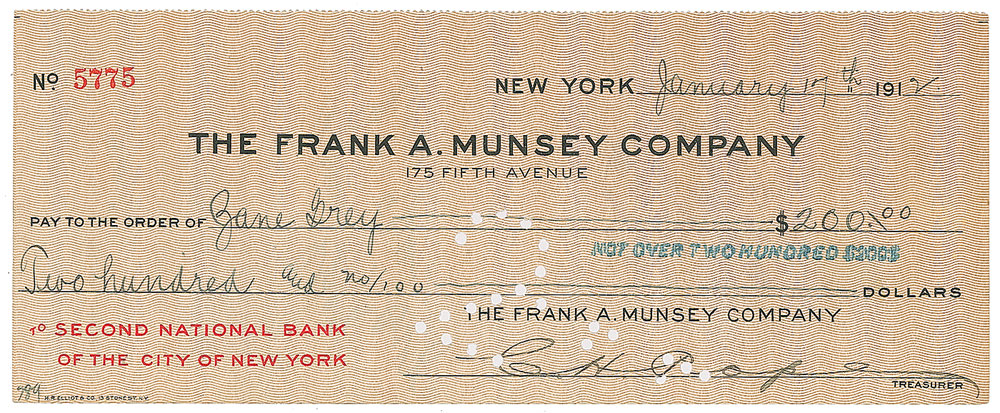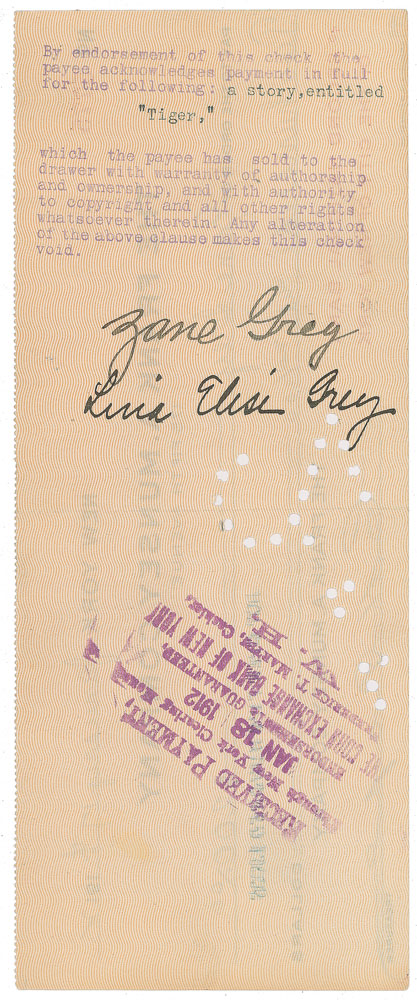 Frank A. Munsey Company business check, 8.25 x 3.25, filled out in another hand and signed by the treasurer, payable to Zane Grey for $200, January 7, 1912, endorsed on the reverse by Grey and his wife, “Zane Grey” and “Lina Elise Grey.” A typed notation above reads, in part: “By endorsement of this check the payee acknowledges payment in full for the following: a story, entitled ‘Tiger.’” In fine condition. Pre-certified PSA/DNA.