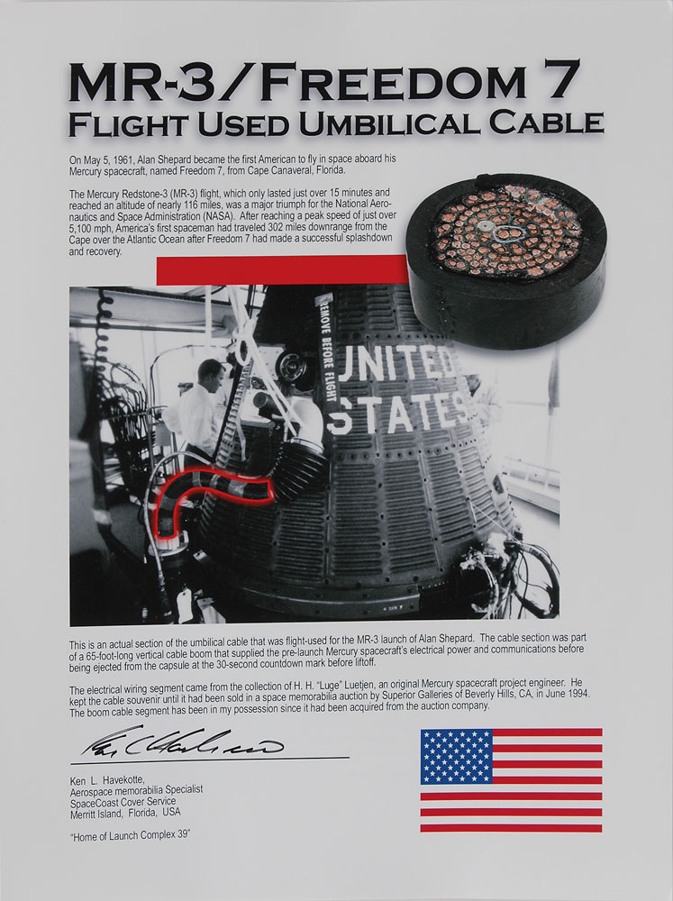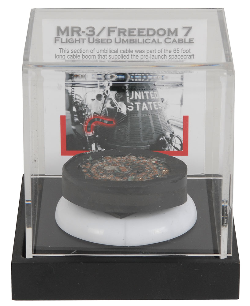 A cut cross section of the umbilical cable used in the MR-3 launch of Alan Shepard’s Freedom 7 on May 5, 1961, measuring approximately 2? in diameter and .5″ thick. In fine condition. Accompanied by a display case and informational certificate of authenticity from Ken Havekotte. This section of cable was part of the 65-foot cable boom that supplied the pre-launch spacecraft with electrical power and communications before being ejected at T-30 seconds. The segment came from a larger piece that once belonged to H. H. ‘Luge’ Luetjen, an original Mercury spacecraft project engineer. From the collection of aerospace memorabilia specialist Ken Havekotte.