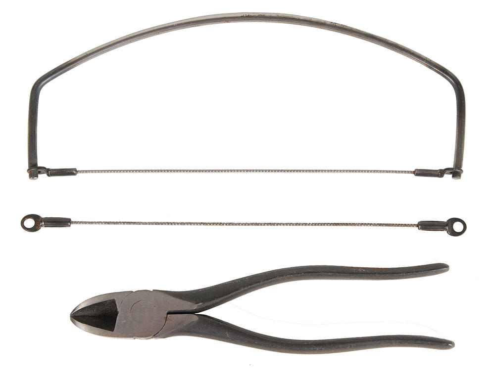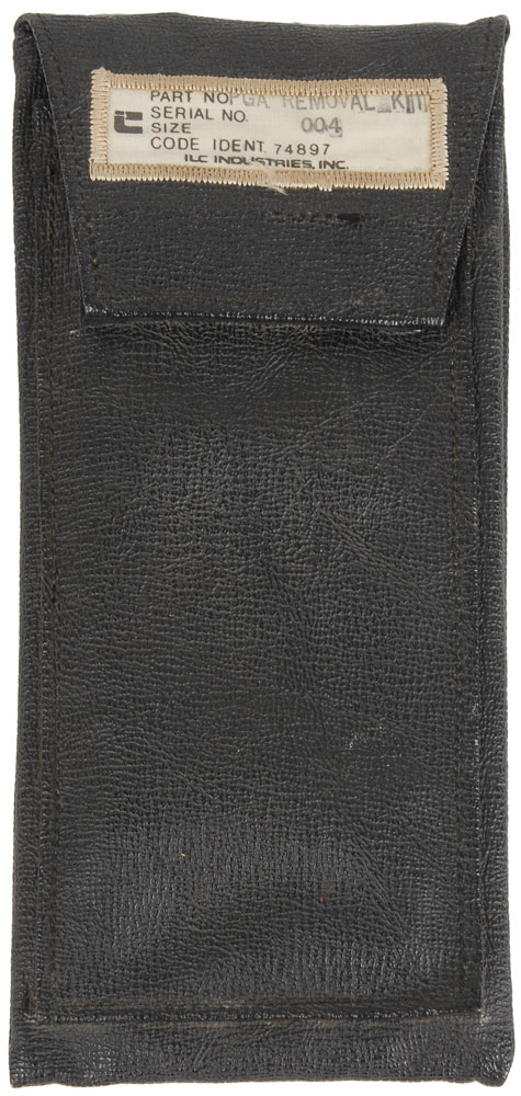 An Apollo space suit Pressure Garment Assembly (PGA) removal tool kit developed by engineers to facilitate the removal of an astronaut or test subject from the space suit in case of malfunction (such as malfunction of the restraint or pressure zippers) or emergency should the subject be unconscious. The simple kit consists of a rod saw with extra blade and heavy-duty nipper type cutters, held in a vinyl case with ILC tag reading, “Part No. PGA Removal Kit, Serial No. 004.” In fine condition. This kit has been authenticated by Bill Ayrey, company historian at ILC Dover, the manufacturer of the Apollo, Shuttle, and Space Station suits, and is accompanied by a letter of provenance from him. These kits were produced in a very limited number.