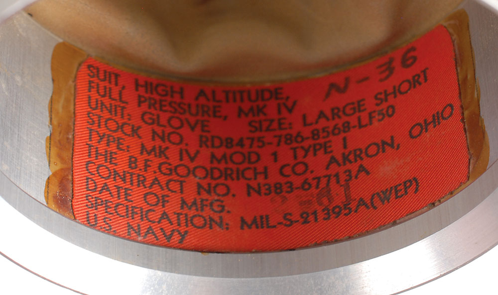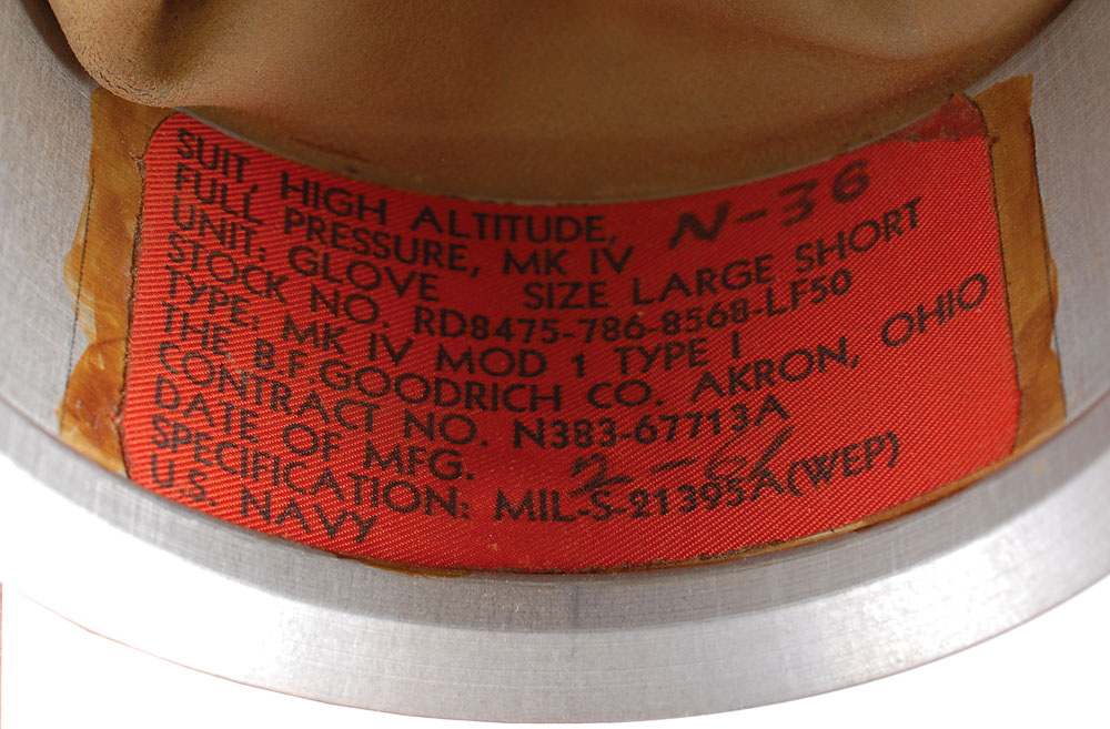 Pair of dark green B. F. Goodrich Mark IV pressure suit gloves as used by high-altitude pilots on the U2 and SR-71 spy planes. Tags affixed inside the wrists indicate a manufacture date of February 1961 and designate the type as “Mk IV Mod 1 Type 1.” In very good to fine condition, with expected wear. This glove design served as the basis for the Mercury space suit gloves, which were also made by B. F. Goodrich.