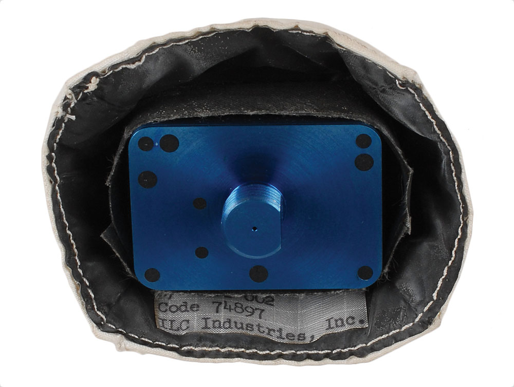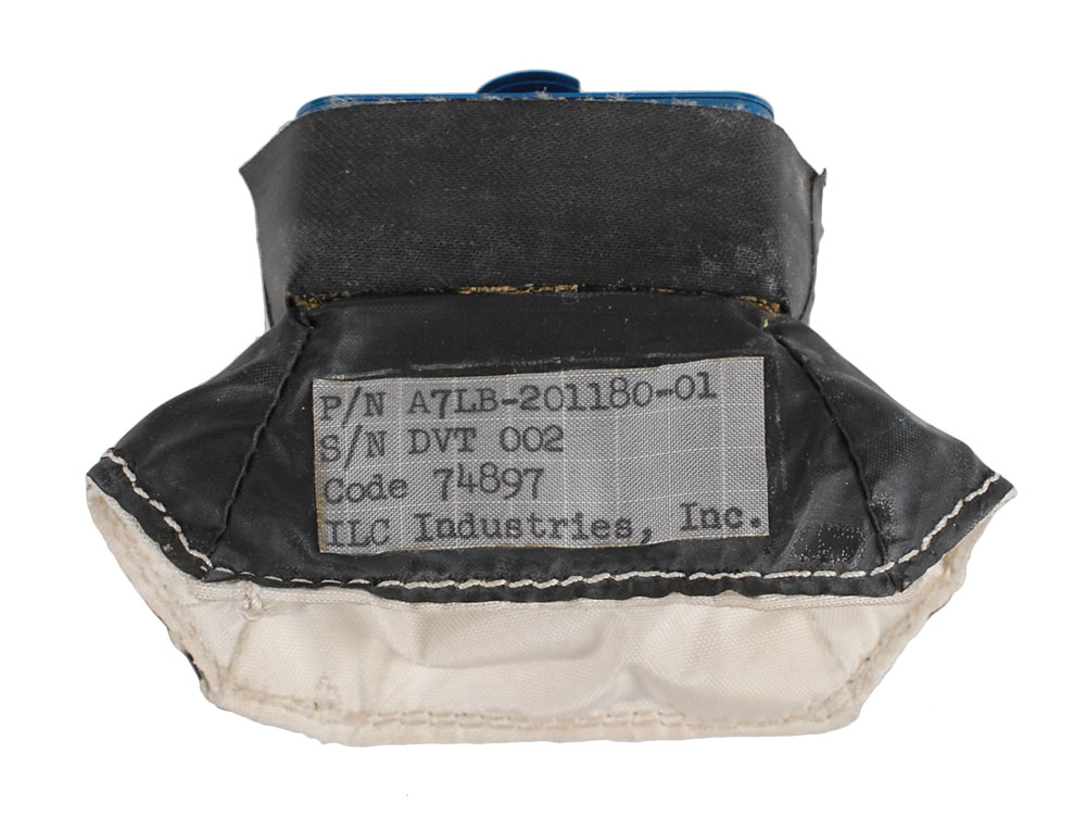 Apollo space suit pressure gauge with beta cloth cover layer, measuring approximately 2.5 x 1.5 x 1, which was located on the lower arm so that the astronauts could quickly verify their suit pressure. The top of the blue housing is engraved, “Pt. No. A6L-104025-04, Ser. No. 365, Mfg. by DMD for ILC Industries, Inc.” The beta cloth covering, which protected the gauge from impact and provided thermal protection from solar rays, has a label inside reading, “P/N A7LB-201180-01, S/N DVT 002, Code 74897, ILC Industries, Inc.” In fine condition. This gauge assembly has been authenticated by Bill Ayrey, company historian at ILC Dover, the manufacturer of the Apollo, Shuttle, and Space Station suits, and is accompanied by a letter of provenance from him. A very seldom seen piece of suit hardware.