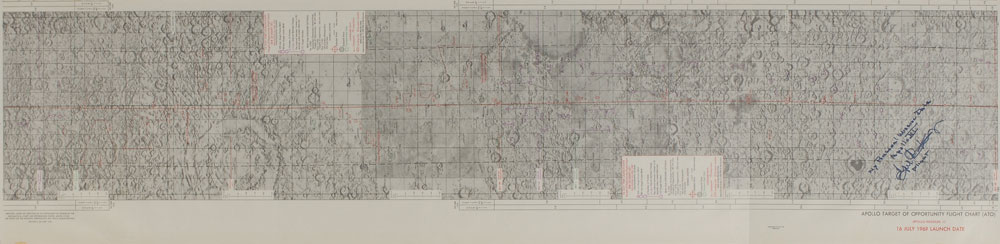 Lunar map used by Gene Kranz in his role as flight director, 58 x 14, signed in black felt tip, “My personal mission data, Apollo XI, Gene Kranz, Flight.” Titled in the lower right, “Apollo Target of Opportunity Flight Chart (ATO), Apollo Mission 11, 16 July 1969 Launch Date.” Rolled and in fine condition, with some creases and dings to edges. Accompanied by a letter of authenticity from Farthest Reaches. An impressively large, outstanding piece of mission-used space history. Pre-certified Zarelli Space Authentication.