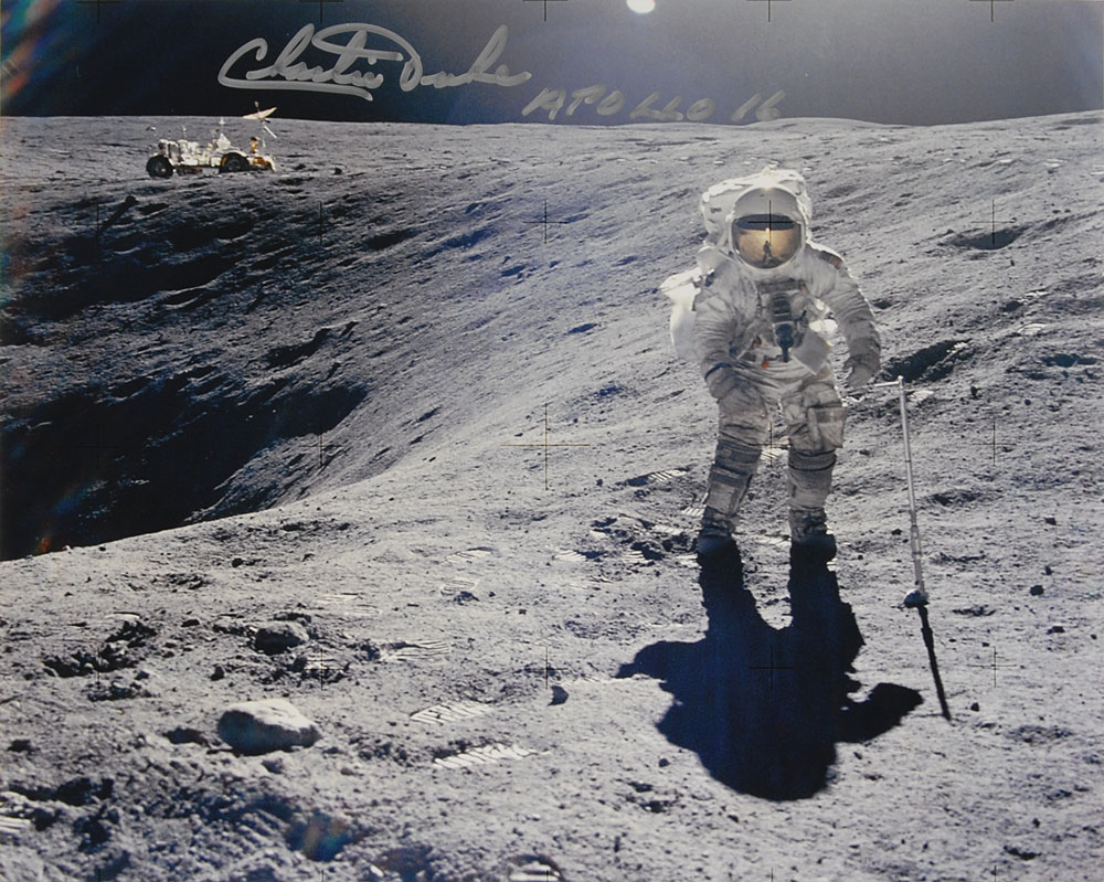 Three color satin-finish 10 x 8 photos individually signed in silver or gold ink by the Apollo astronaut pictured, including: “Buzz Aldrin,” “Charlie Duke, Apollo 16,” and “Antares, Edgar Mitchell, Apollo 14.” In overall fine condition. Pre-certified Zarelli Space Authentication.