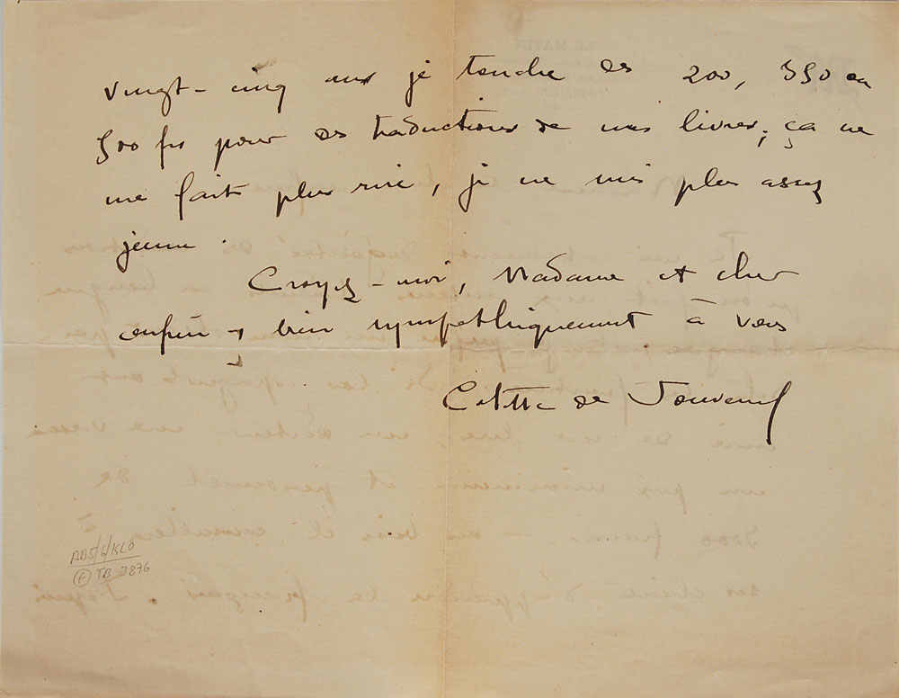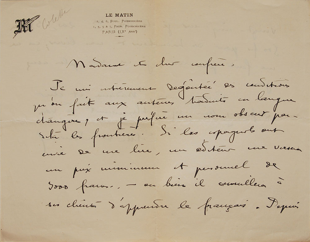 The daughter of French writer Colette and her second husband, Henri de Jouvenel. Untranslated ALS in French, one page both sides, 10.5 x 8.25, Le Matin letterhead, no date. In fine condition.