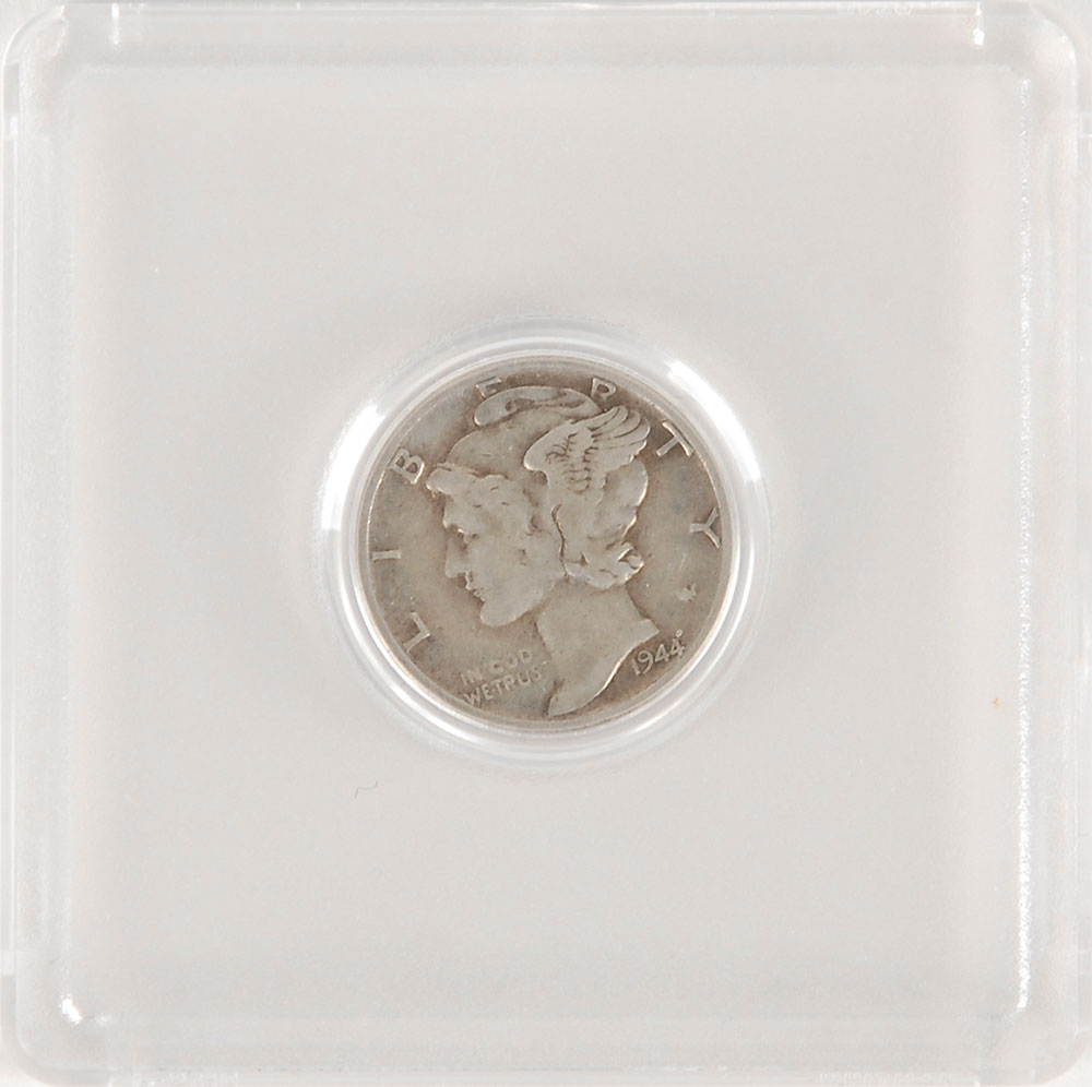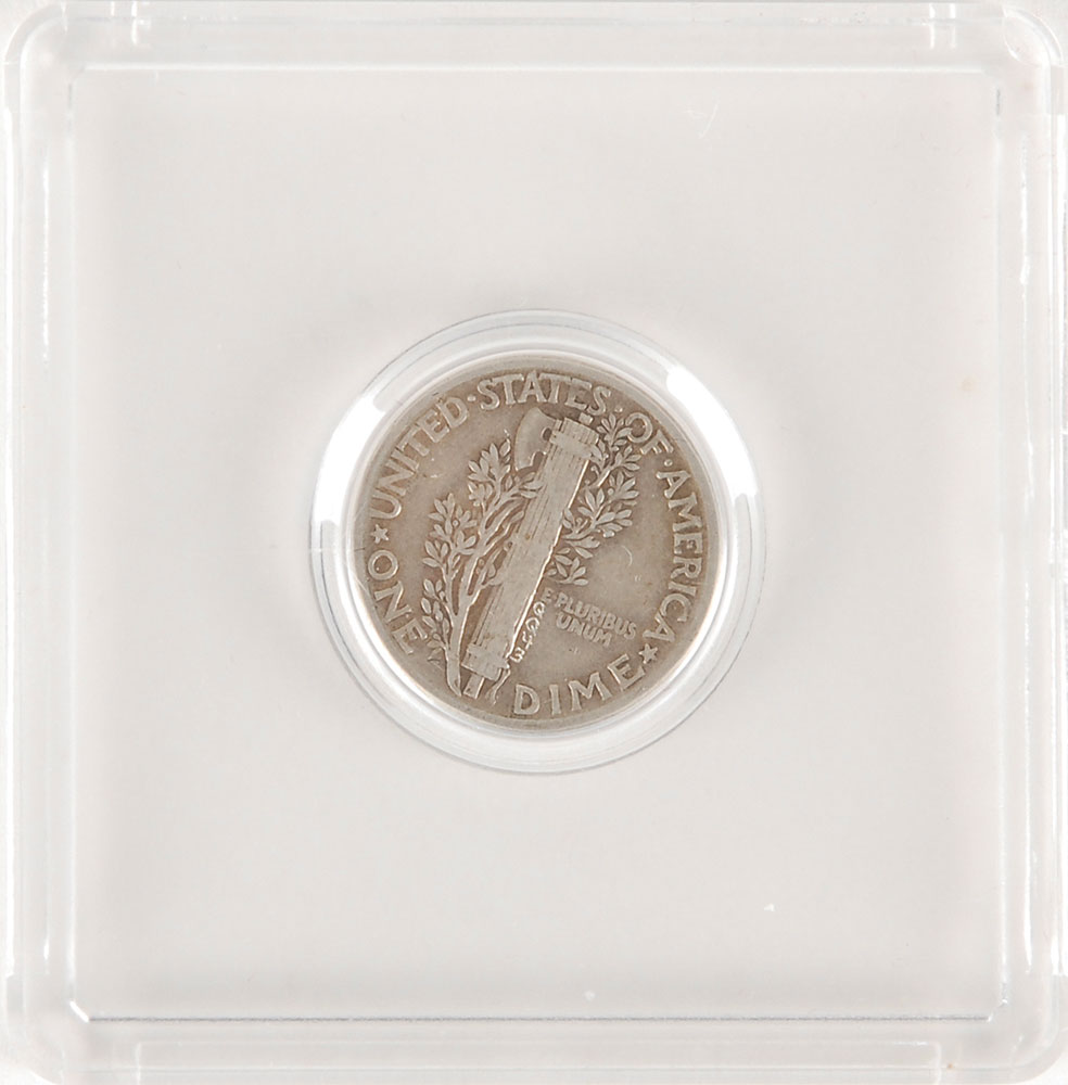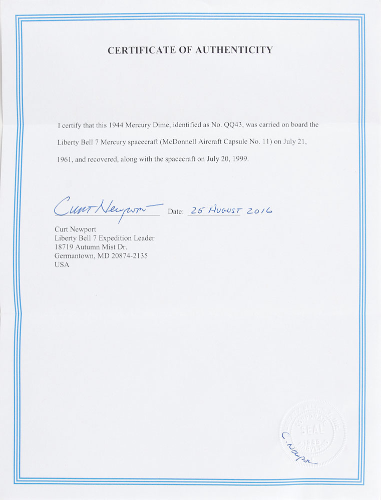 Historic silver 1944 Mercury Head dime recovered from Gus Grissom’s Liberty Bell 7 spacecraft almost 38 years to the day after the Mercury capsule and its contents were lost at sea. The coin etched on the reverse with the identification “QQ43” and is held in a plastic case. Accompanied by a certificate of authenticity signed by Curt Newport, who led the expedition to find the Liberty Bell 7, in full: “I certify that this 1944 Mercury Dime, identified as No. QQ43, was carried on board the Liberty Bell 7 Mercury spacecraft (McDonnell Aircraft Capsule No. 11) on July 21, 1961, and recovered, along with the spacecraft on July 20, 1999.” A total of 52 dimes were recovered from the Liberty Bell once rediscovered at the ocean's floor. This unique item holds the distinction of voyaging to the edge of space at an altitude of 118 miles, and then sinking 16,000 feet to the bottom of the Atlantic Ocean in the only manned spacecraft to be lost at sea—all within a few hours span. A very scarce offering with wonderful Mercury association. From the McGlynn Space Collection.