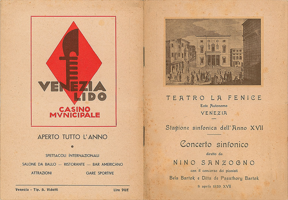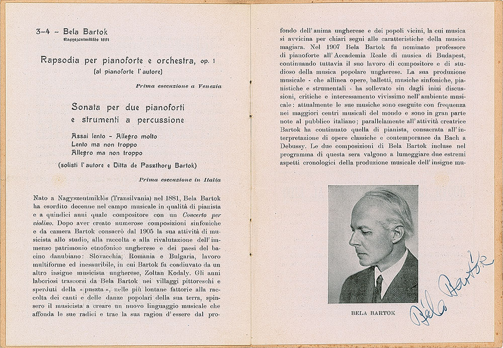 Italian program for a performance at the Teatro La Fenica on April 8, 1939, measures 10.75 x 7.5 open, signed inside next to his image in fountain pen by Bartok. In fine condition, with foxing to the covers and light handling wear. Pre-certified PSA/DNA.