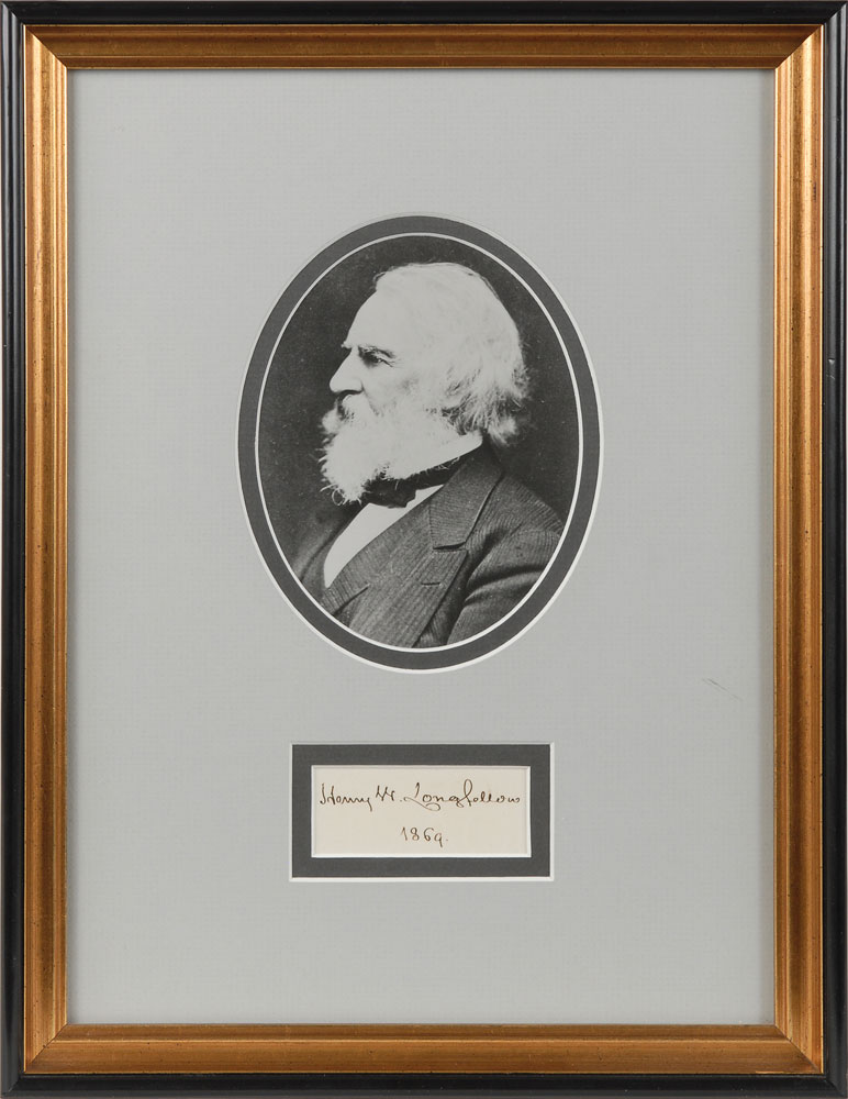 Ideal ink signature, “Henry W. Longfellow, 1869,” on an off-white 2.5 x 1 slip. Double-matted and framed with a profile of Longfellow to an overall size of 10.25 x 13.25. In fine condition. Pre-certified PSA/DNA.