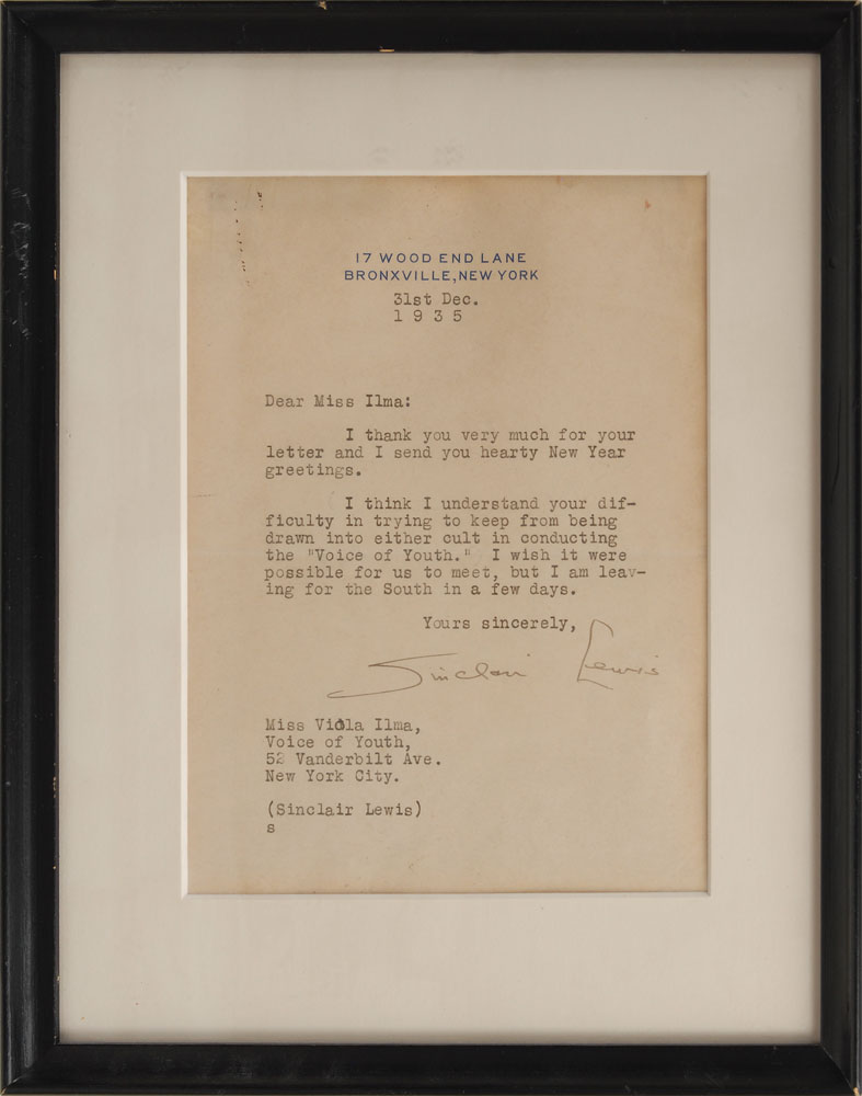 TLS, one page, 5.25 x 7, 17 Wood End Lane letterhead, December 31, 1935. Letter to Viola Lima, in full: “Thank you very much for your letter and I send you hearty New Year greetings. I think I understand your difficulty in trying to keep from being drawn into either cult in conducting the ‘Voice of Youth.’ I wish it were possible for us to meet, but I am leaving for the South in a few days.” Matted and framed. In fine condition. Pre-certified PSA/DNA.