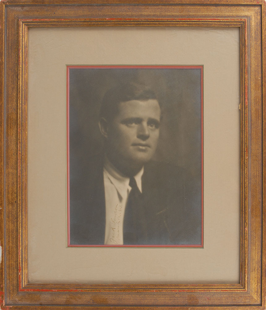 Brilliant vintage matte-finish 6.5 x 9 head-and-shoulders portrait of London wearing a suit and tie, vertically signed within his shirt area in fountain pen, “Jack London, March 14, 1913.” Double-matted and framed to an overall size of 13.5 x 15.5. In fine condition, with slight fading to the handwriting, and light silvering to the perimeter. In 1913, among various short stories and poetry, London published a pair of fictitious novels—The Abysmal Brute and The Valley of the Moon—and what would be his final autobiographical novel in John Barleycorn, a book that dealt with his fondness for drink and subsequent struggles with alcoholism. London is scarce in signed photos, with this example being the largest we’ve ever offered. Pre-certified PSA/DNA.