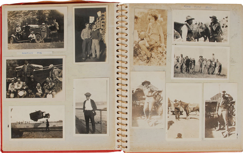 Photo album containing over 130 original circa 1920s candid photos of various Famous Players-Lasky filming locations, with images identified as “Catalina,” “Crystal Beach,” “Mammoth,” “Palm Springs,” “King City,” “Canyon du Chelley,” “Acoma,” “The Gap,” and “Bryce Canyon.” These appear to mostly be Western-themed settings, and several of the images offer behind-the-scenes views of production, including cameras and sets; others portray the remarkable Western landscape. Also includes eleven loose photos. In overall very good to fine condition. An uncommon and interesting collection of photos that offer a peek ‘behind the curtain’ of early cinema.