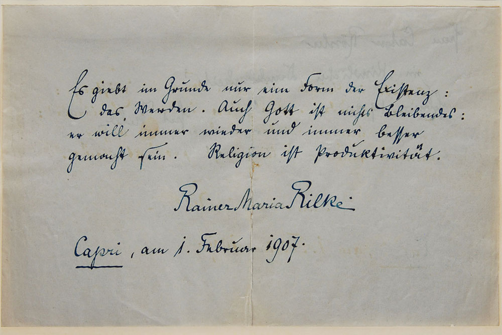 AQS in German, one page, 8.75 x 5.5, February 1, 1907. In full (translated): "Basically, there's only one form of existence: Becoming. God, too, is nothing permanent: he wants to be created again and again and ever better. Religion is productivity." Affixed by the top edge to a slightly larger sheet. In very good to fine condition, with a central vertical fold and mild show-through from writing to reverse.