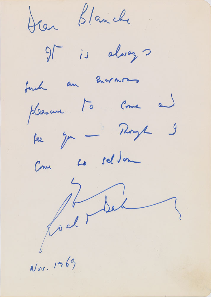Scarce ALS, one page, 7.75 x 11, November 1969. Letter to Blanche, in full: “It is always such an enormous pleasure to come and see you—Though I come so seldom.” In fine condition. Pre-certified PSA/DNA.