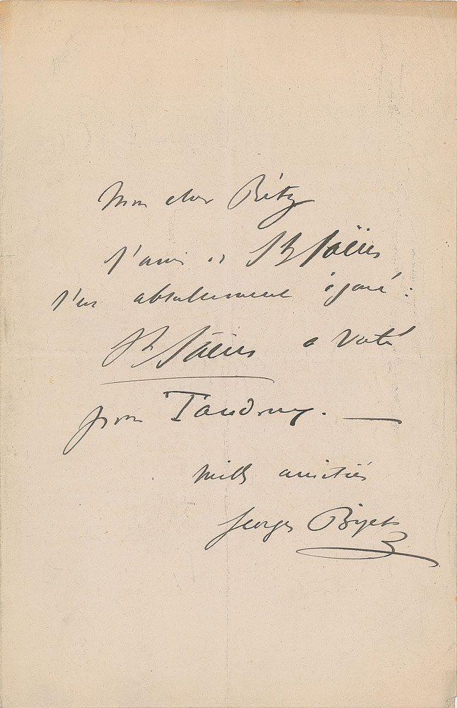 French composer (1838–1875) whose operatic masterpiece, Carmen, was completed just before his untimely death from heart disease. Sought-after ALS in French, one page, 5.25 x 8.25, no date. Letter to Secretary of the Conservatoire Emile Rety, in full (translated): "The friend of Saint-Saens is absolutely wrong. Saint-Saens voted for Taudoux.” In fine condition. Bizet’s transcription for piano of Saint-Saens’s Piano Concerto # 2 is still in the current repertory. A desirable association piece boasting a crisp full signature. Pre-certified PSA/DNA.