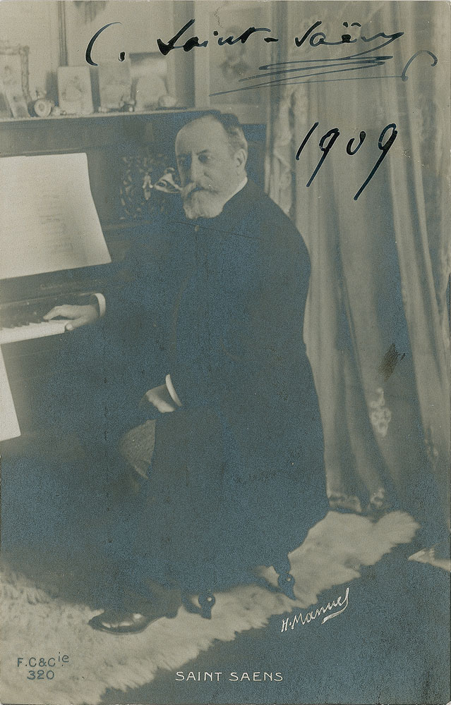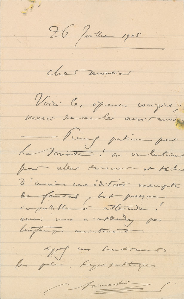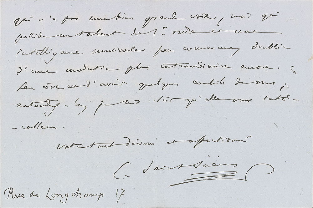 Desirable collection of three items: a 3.5 x 5.5 postcard photo of the composer at his piano, signed in bold ink, “C. Saint-Saens, 1909”; an ALS signed “C. Saint-Saens,” one page, July 26, 1905, in part (translated): "Here are the corrected proofs…Be patient with the sonata. We’ll go slowly, to be safe. We’ll strive for an error free edition, a goal almost impossible to achieve!”; and an ALS signed “C. Saint-Saens,” three pages on two adjoining sheets, December 18, 1904, to Pauline Viardot-Garcia, in full (translated): “I’ve given Madame Bressler-Gianoli a letter of recommendation for you. She just sang two pieces of mine at the Chevillard Concert. She’s just a little slip of a woman who doesn’t have a very large voice but she possesses a talent of the 1st order and a musical intelligence rarely found, accompanied by an even more extraordinary modesty. Her dream is to obtain some words of advice from you. Listen to her. I am sure that she will interest you.” In overall fine condition.