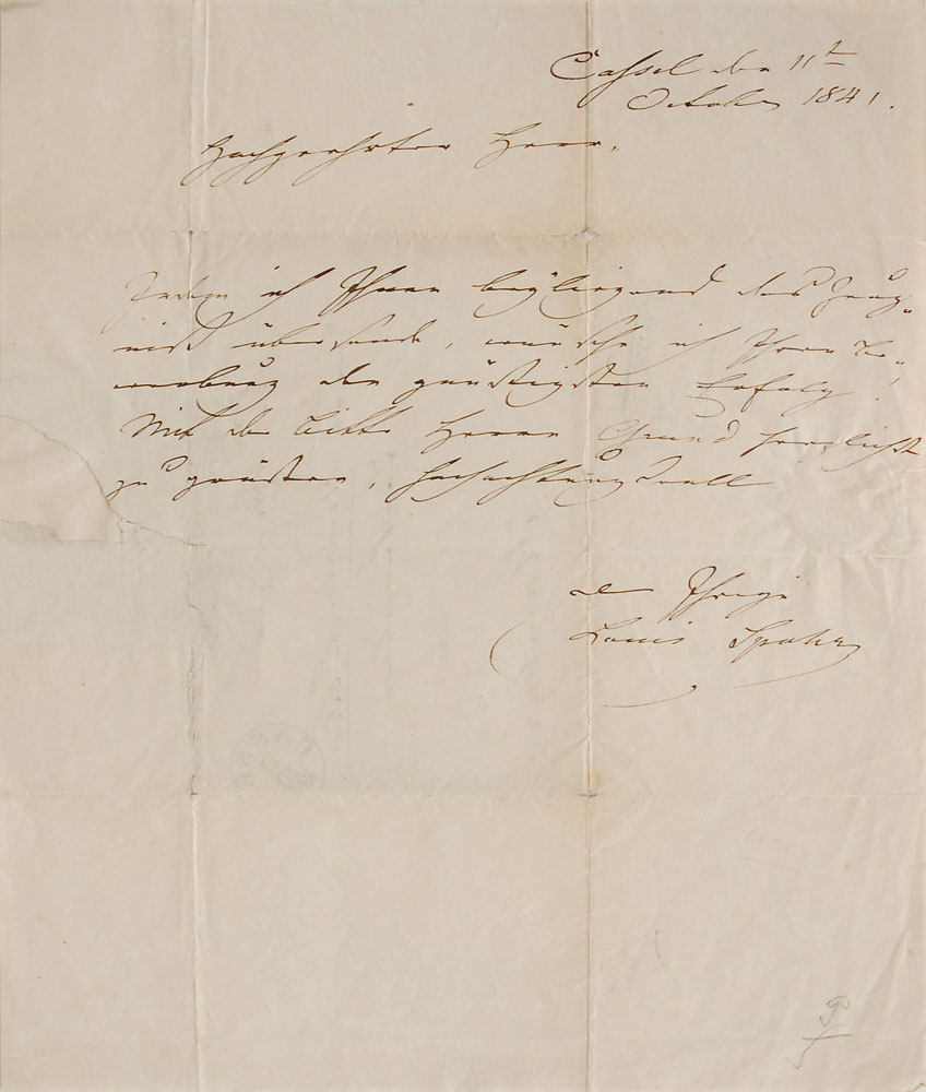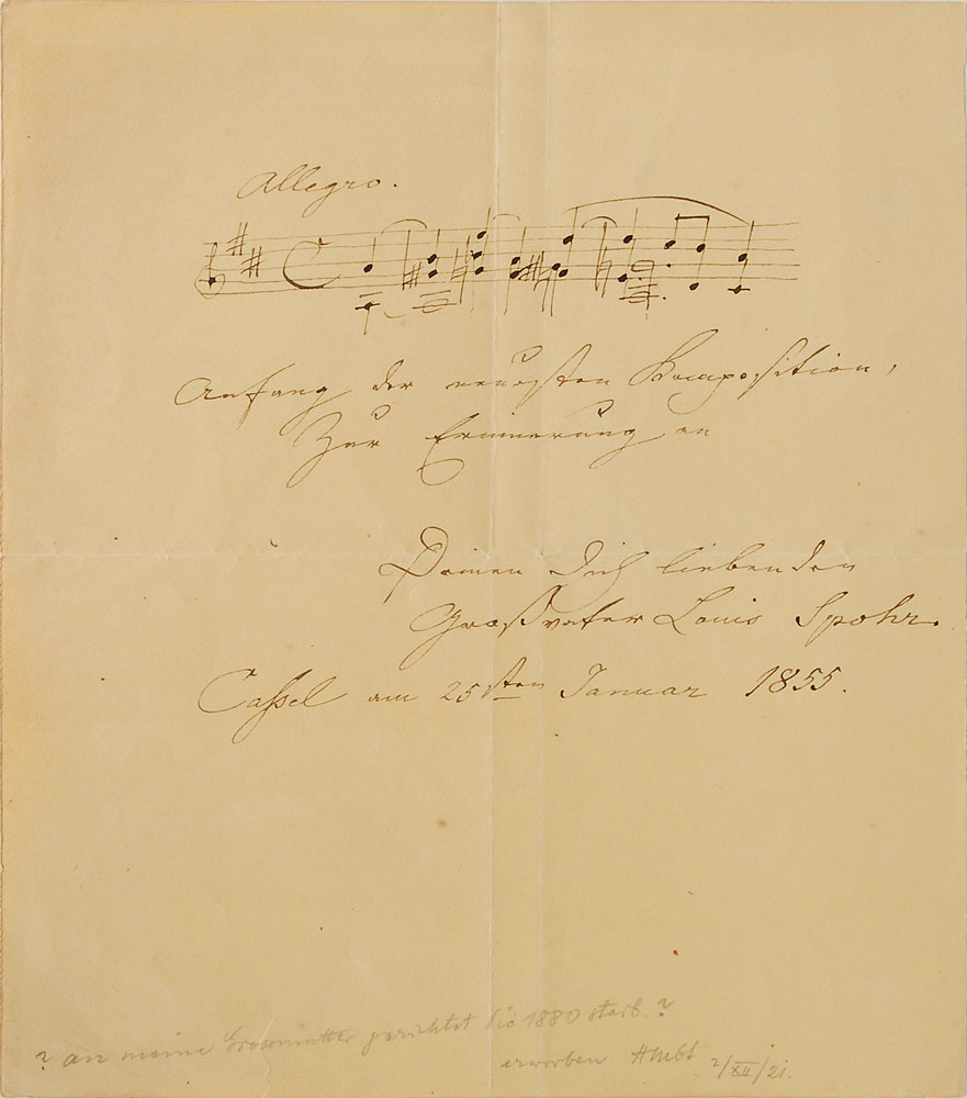 German composer, violinist, and conductor (1784–1859). Two items: a two-bar AMQS on a 6.25 x 7.75 sheet, signed and inscribed in German to his granddaughter (translated), “The beginning of the newest composition. As a souvenir of your grandfather who loves you, Louis Spohr, Kassel, 25 January 1855”; and an ALS in German, one page, 8.5 x 10, October 11, 1841, to “Mr. Heinrich Ehrkamp, Composer,” in part (translated): "In sending you the enclosed testimonial, I wish you the greatest success.” In overall very good to fine condition, with repaired tears and paper loss to the letter. Pre-certified PSA/DNA.