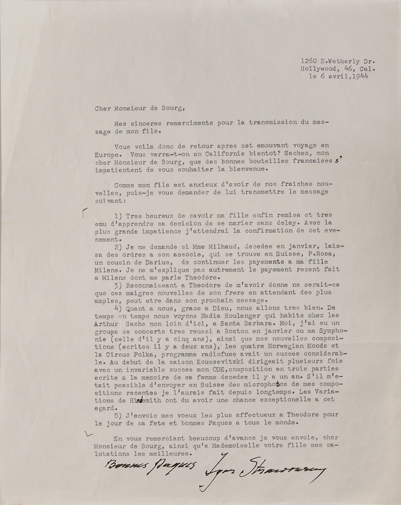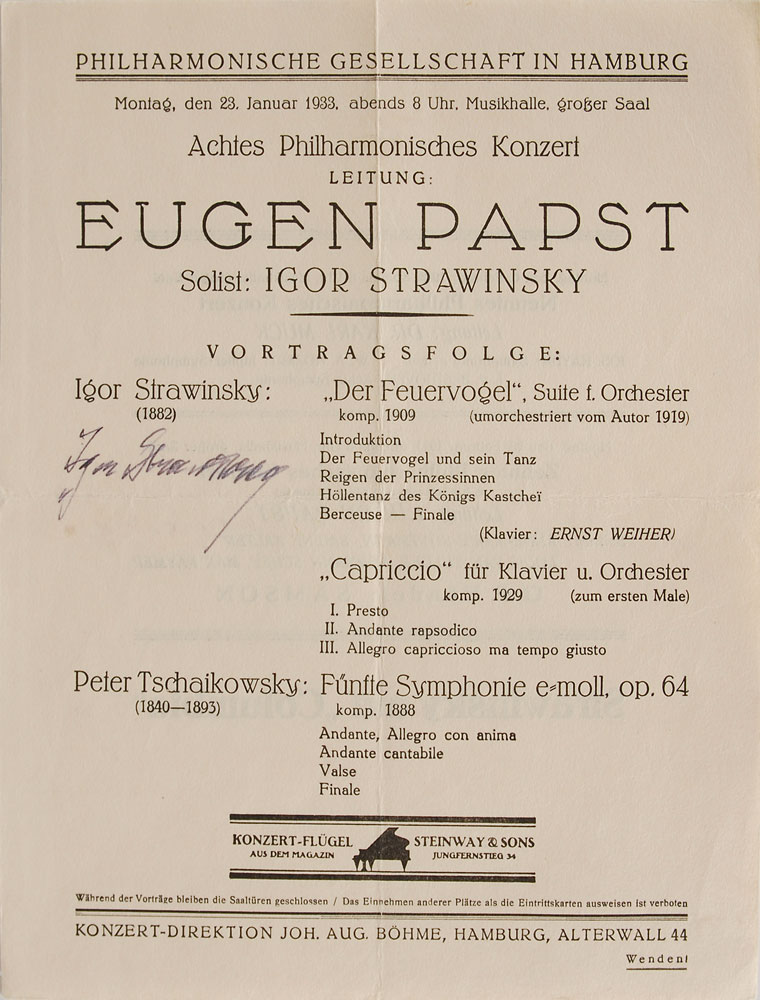 Two items: a TLS in French, signed “Happy Easter, Igor Stravinsky,” one page, 8.5 x 11, April 6, 1944, in part (translated): "Bottles of French wines eagerly await you…We see Nadia Boulanger occasionally…very successful concerts in Boston…my Symphony (the 5 year old one), as well as my new compositions, the ‘Four Norwegian Moods’ and the ‘Circus Polka’…Koussevitski conducted my Ode, a 3-part composition written in memory of his wife…If I could send microphotos of my recent compositions I would have done so long ago. The Hindemith Variations…were exceptionally lucky in that respect”; and a program sheet for a Stravinsky performance in Hamburg on January 23, 1933, signed later in black felt tip by Stravinsky. In overall fine condition. Pre-certified PSA/DNA.