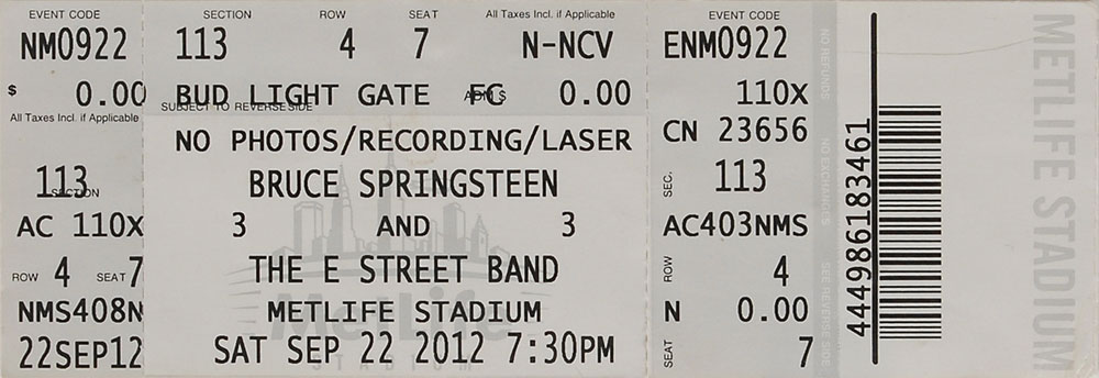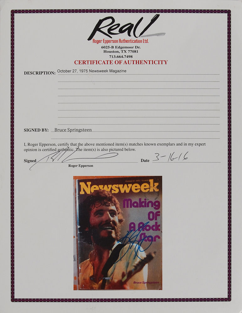 Newsweek magazine from October 27, 1975, showing Springsteen on the cover with the caption, “Making of a Rock Star,” 8.25 x 11, 108 pages, signed on the front cover in blue felt tip. In very good condition, with scattered creasing and some tears to edges. Accompanied by a full letter of authenticity from REAL, a concert ticket, and a copy of a letter of provenance from the original recipient with a photo taken at the time of signing, in part: “This magazine was signed by Bruce Springsteen in front of me after I attended his momentous birthday show at Metlife Stadium in New Jersey on September 22, 2012.”