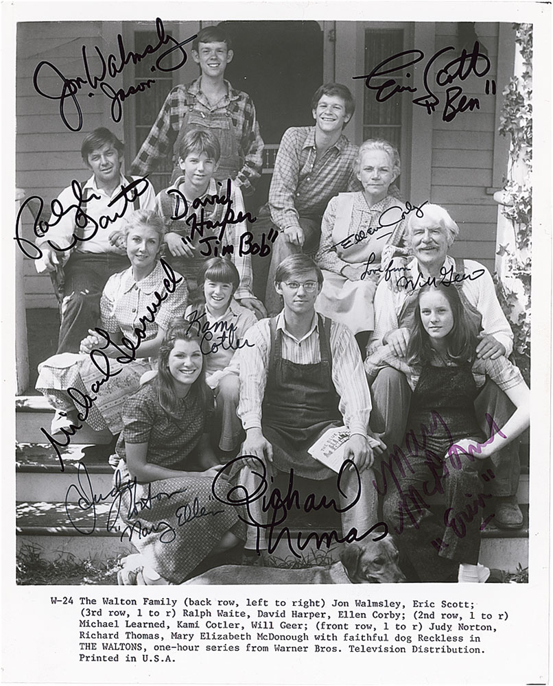 Uncommon glossy 8 x 10 Warner Brothers publicity photo of the cast of The Waltons, signed in various colored felt tip each actor or actress pictured, with several adding their character name, including: Will Geer, Ellen Corby, Michael Learned, Ralph Waite, Richard Thomas, Jon Walmsley, Eric Scott, David Harper, Judy Norton, Mary McDonough, and Kami Cotler. In fine condition. An impressive combination from this classic 1970s TV show. Pre-certified PSA/DNA.