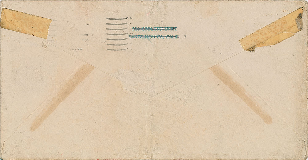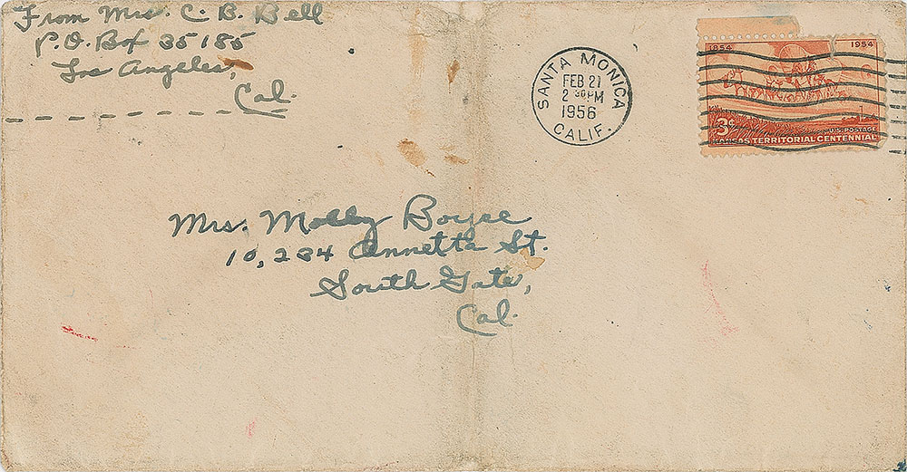 Hand-addressed mailing envelope, 7.5 x 4, addressed by Bow to "Mrs. Molly Boyce, 10,234 Annetta St., South Gate, Cal.," and signed in the return address area with her married name, "From Mrs. C. B. Bell, P.O. Box 35185, Los Angeles, Cal." Postmarked Santa Monica, California, February 21, 1956. In very good condition, with a central vertical fold, and overall staining and creasing. Accompanied by a modern photo of the actress.