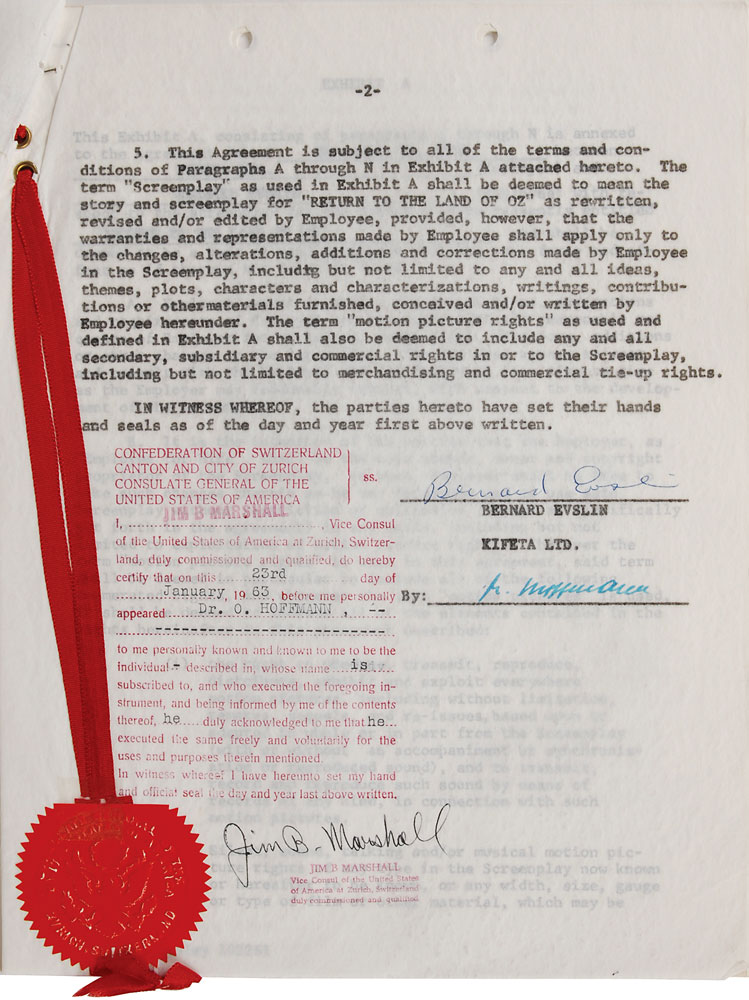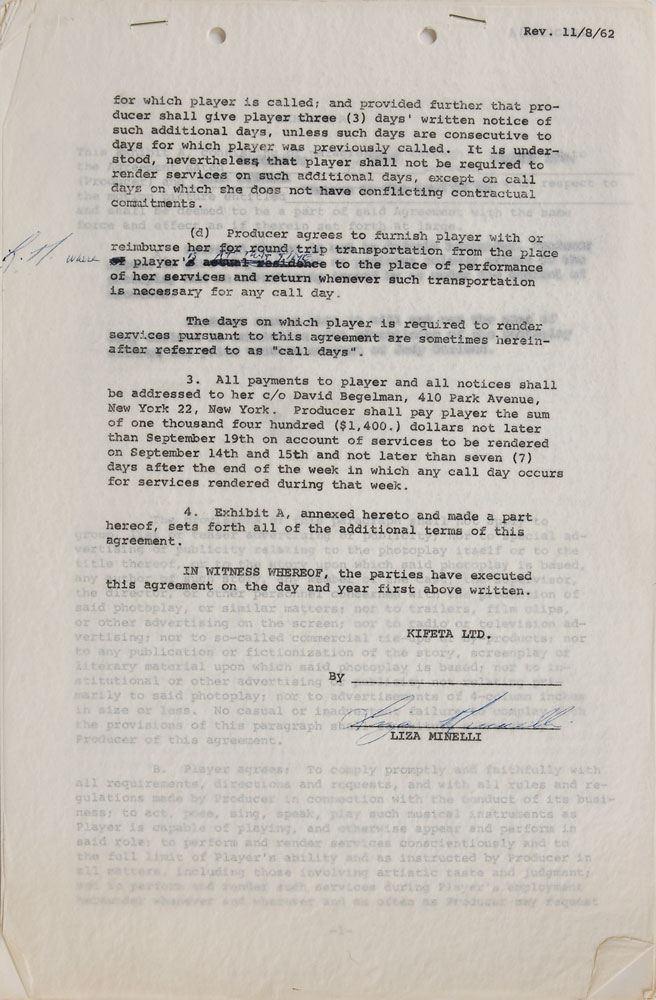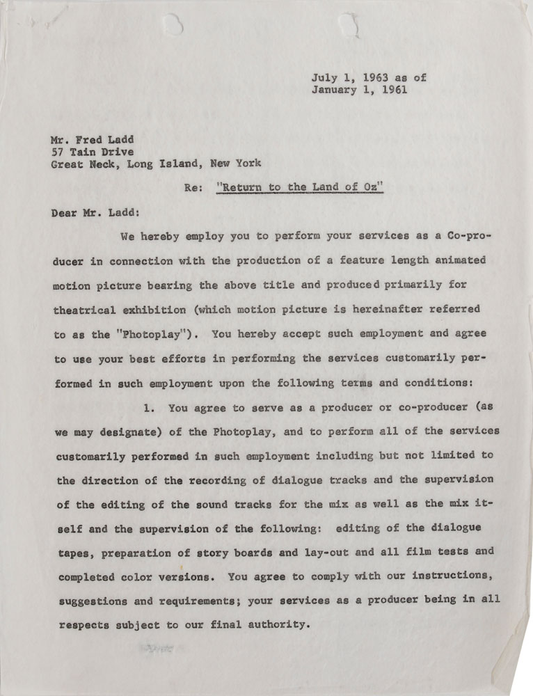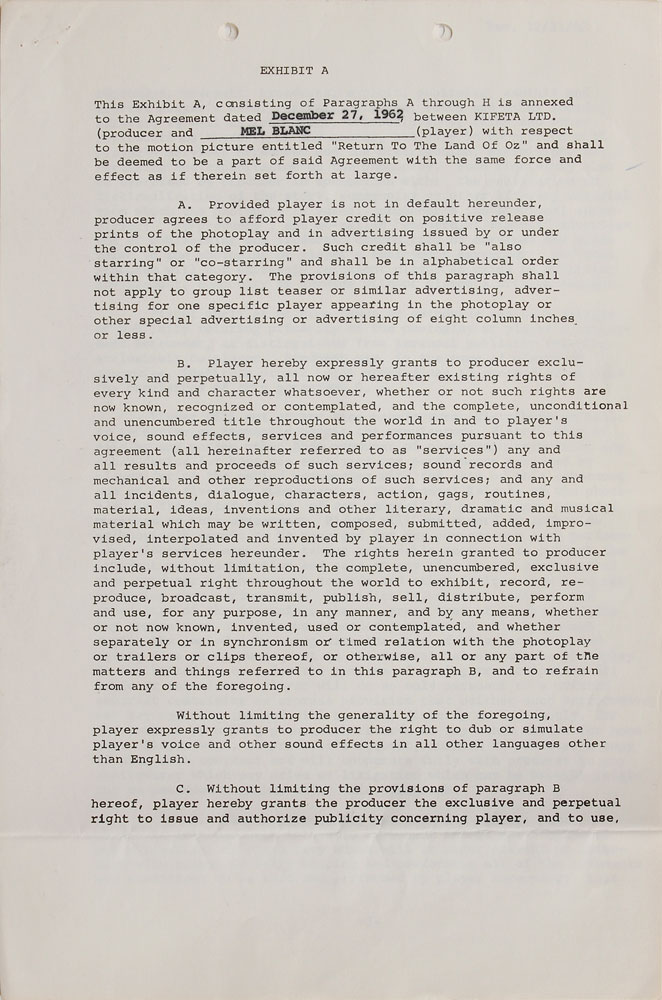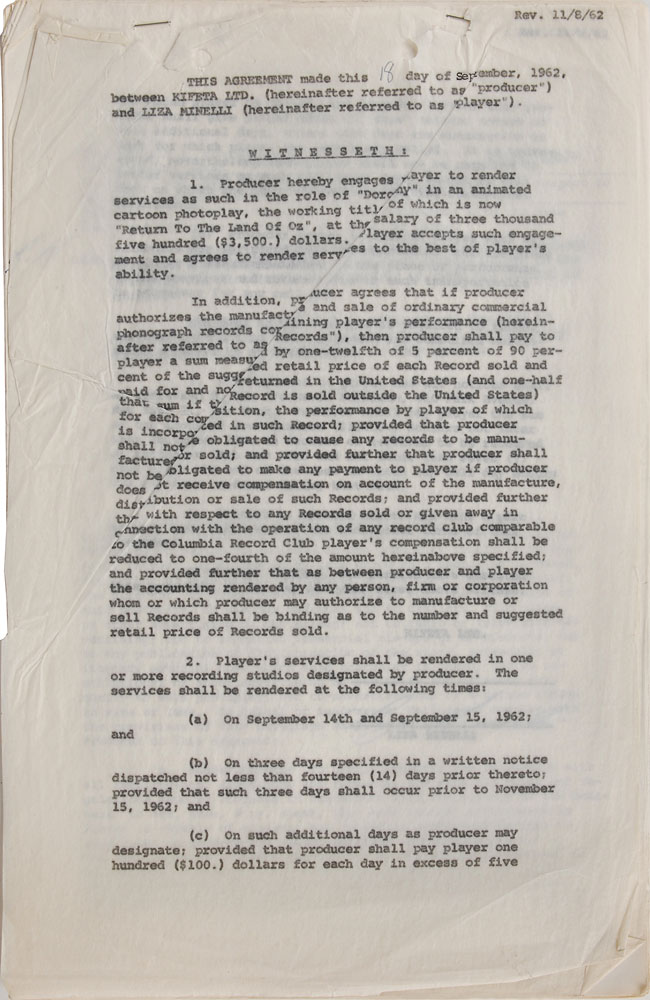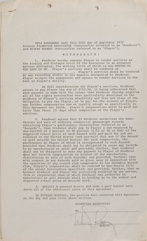 Collection of contracts for the production of the animated film Journey Back to Oz, dated from 1962 to 1970, signed by various members of the cast and crew, including: Liza Minnelli (1962), Mel Blanc (1962), Bernard Evslin (1962), Fred Ladd (1963), Mary Ellen Bute (1964), and Mickey Rooney (1970). In overall very good to fine condition, with some scattered creasing (most notably to the detached first page of Minnelli document). Originally entitled Return to the Land of Oz, this film began production in 1962 but was not finally released until 1974 as Journey Back to Oz. Most notably, this would have been Liza Minelli's first major credited role-following in her mother's footsteps as the voice of Dorothy-as her part was recorded in 1963. However, due to production troubles, delays, and lack of financing, it was not completed for another decade.