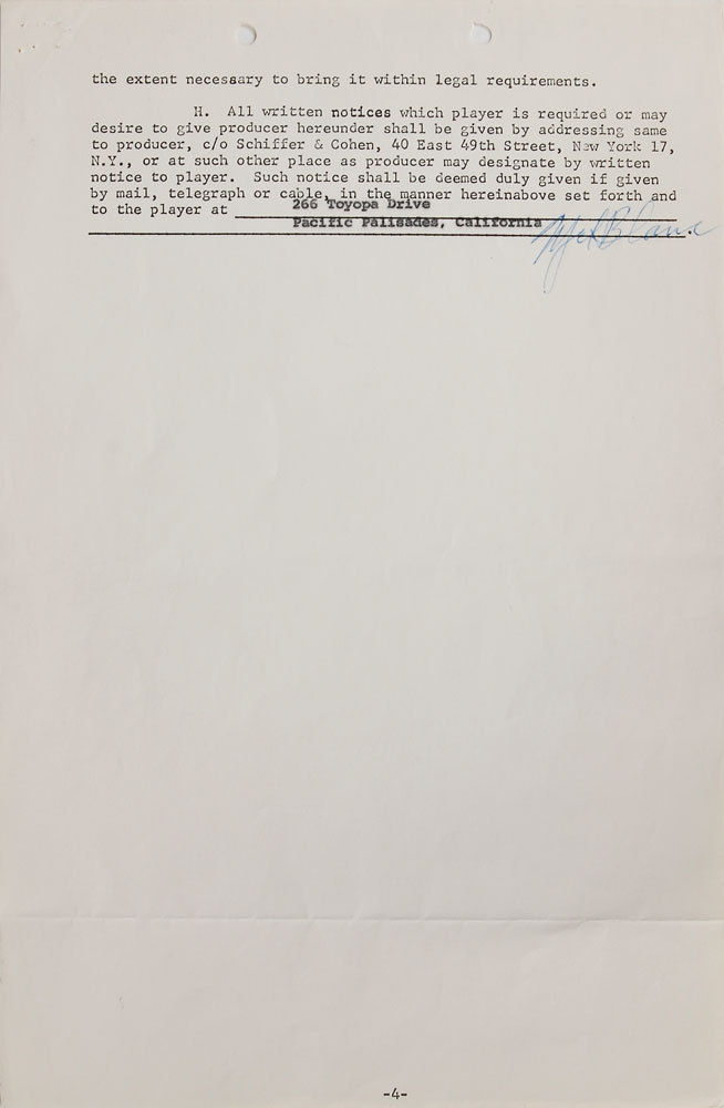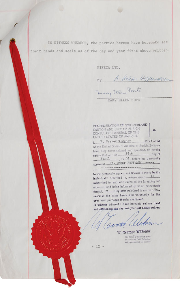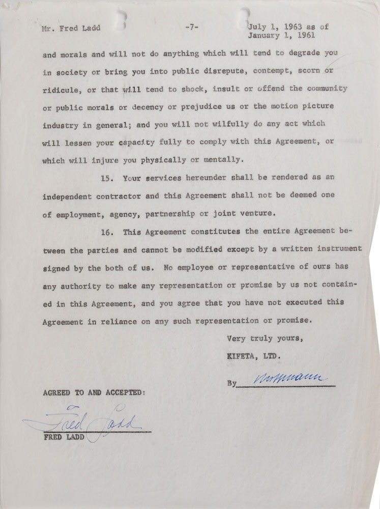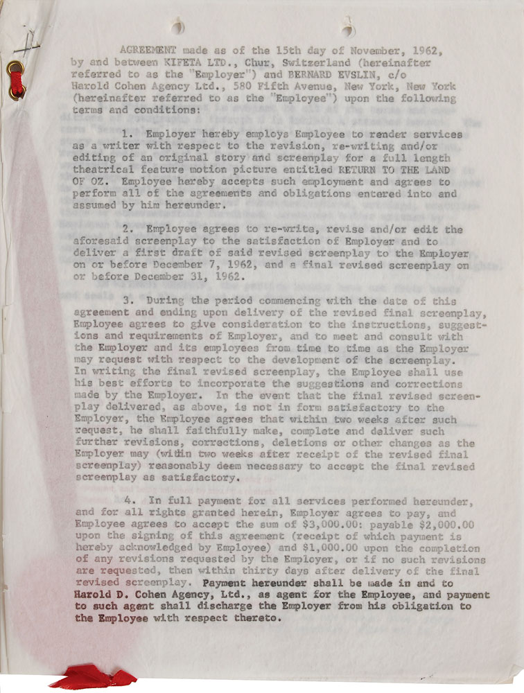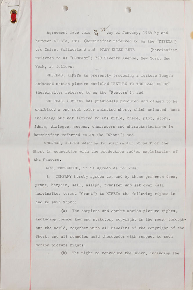 Collection of contracts for the production of the animated film Journey Back to Oz, dated from 1962 to 1970, signed by various members of the cast and crew, including: Liza Minnelli (1962), Mel Blanc (1962), Bernard Evslin (1962), Fred Ladd (1963), Mary Ellen Bute (1964), and Mickey Rooney (1970). In overall very good to fine condition, with some scattered creasing (most notably to the detached first page of Minnelli document). Originally entitled Return to the Land of Oz, this film began production in 1962 but was not finally released until 1974 as Journey Back to Oz. Most notably, this would have been Liza Minelli's first major credited role-following in her mother's footsteps as the voice of Dorothy-as her part was recorded in 1963. However, due to production troubles, delays, and lack of financing, it was not completed for another decade.