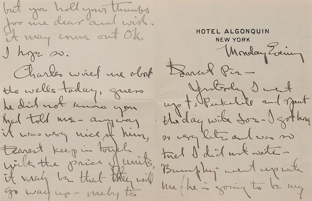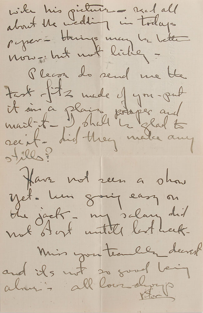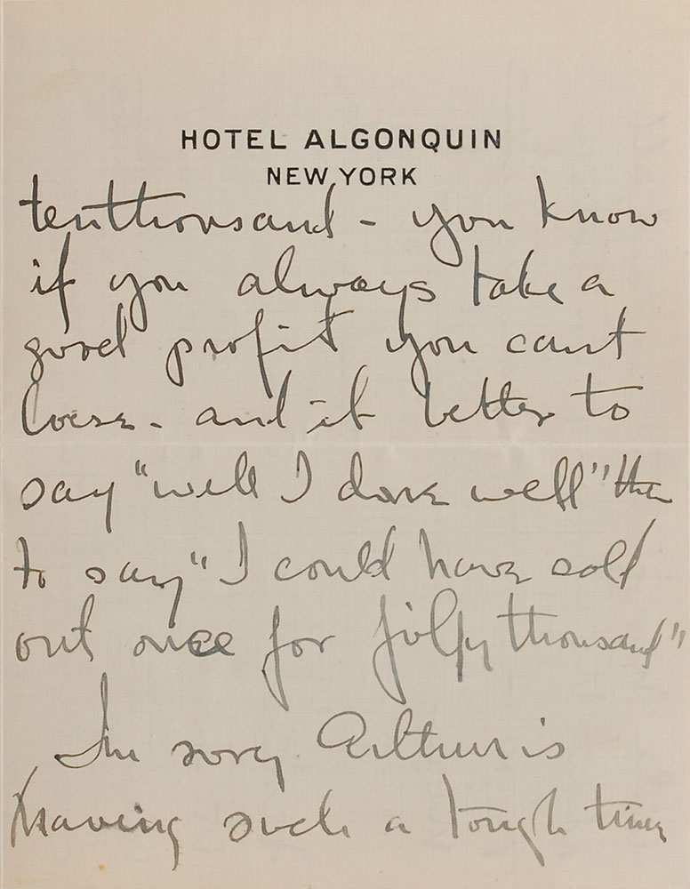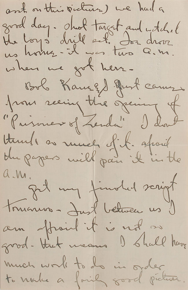 ALS signed “Victor,” seven pages two sets of adjoining sheets, 5 x 6.5, Hotel Algonquin letterhead, postmarked August 1, 1922. Letter to actress Kathleen Clifford, in part: “We had a good day, shot target and watched the boys drill…Bob Kane and I just came from seeing the opening of ‘Prisoner of Zenda.’ I don’t think so much of it, afraid the papers will pan it in the a.m. Get my finished script tomorrow—just between us I am afraid it is not so good—that means I shall have much work to do in order to make a good picture, but you hold your thumbs for me dear and with—it may come out OK. I hope so…I’m sorry Arthur is having such a tough time with his picture—read all about the wedding in today’s papers—things may be better now—but not likely. Please do send me the test Fitz made of you…I shall be glad to see it—did they make any stills? Have not seen a show yet…My salary did not start until last week.” In fine condition. Accompanied by the original mailing envelope addressed in his own hand. Accompanied by a reprint photo. Though he was a cinematographer on several films throughout the 1910s, Fleming did not make his directorial debut until 1919, and at the time of writing had just six director’s credits to his name. A very early letter with excellent cinematic content. Pre-certified PSA/DNA.