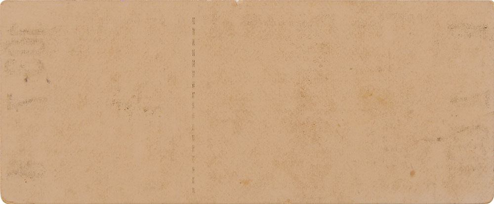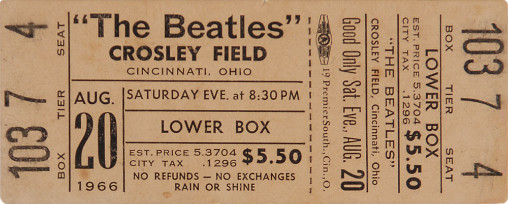Original unused beige 4 x 1.5 concert ticket for a Beatles performance held at Crosley Field in Cincinnati, Ohio, on August 20, 1966, at 8:30 p.m., issued for Box 103, Tier 7, and Seat 4. In fine condition, with some rubbing to the ink. The concert was ultimately postponed until the following day at noon due to heavy rain and the risk of electrocution.