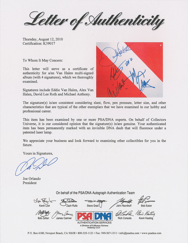 Diver Down album signed on the front cover in black felt tip by Eddie Van Halen, Alex Van Halen, David Lee Roth, and Michael Anthony. In very good to fine condition, with scattered scuffing, edge and corner creasing, four pieces of tape affixed to reverse, and a PSA/DNA label affixed to the lower corner. Accompanied by full letters of authenticity from PSA/DNA and REAL. The record is not included.