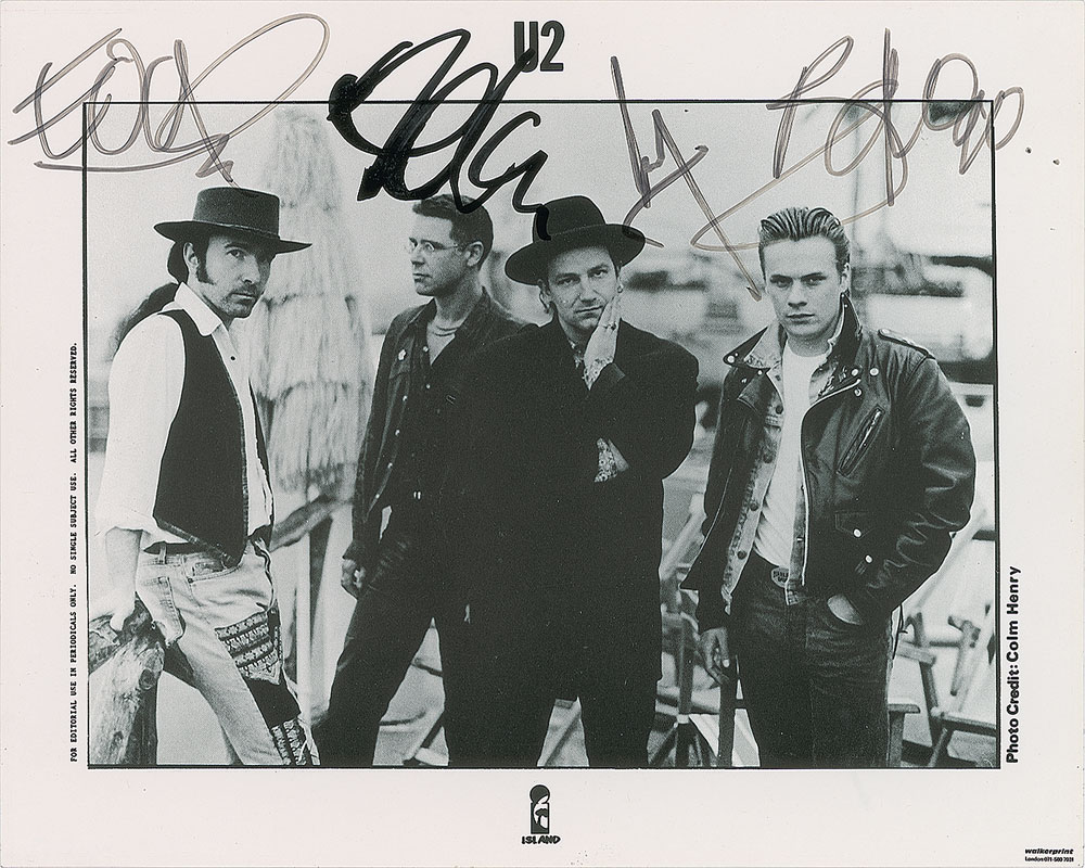 Semi-glossy 10 x 8 Island Records publicity photo of U2, signed in black felt tip, “Edge,” “Adam,” “Larry,” and “Bono 90.” In fine condition. Accompanied by full letters of authenticity from JSA and REAL.
