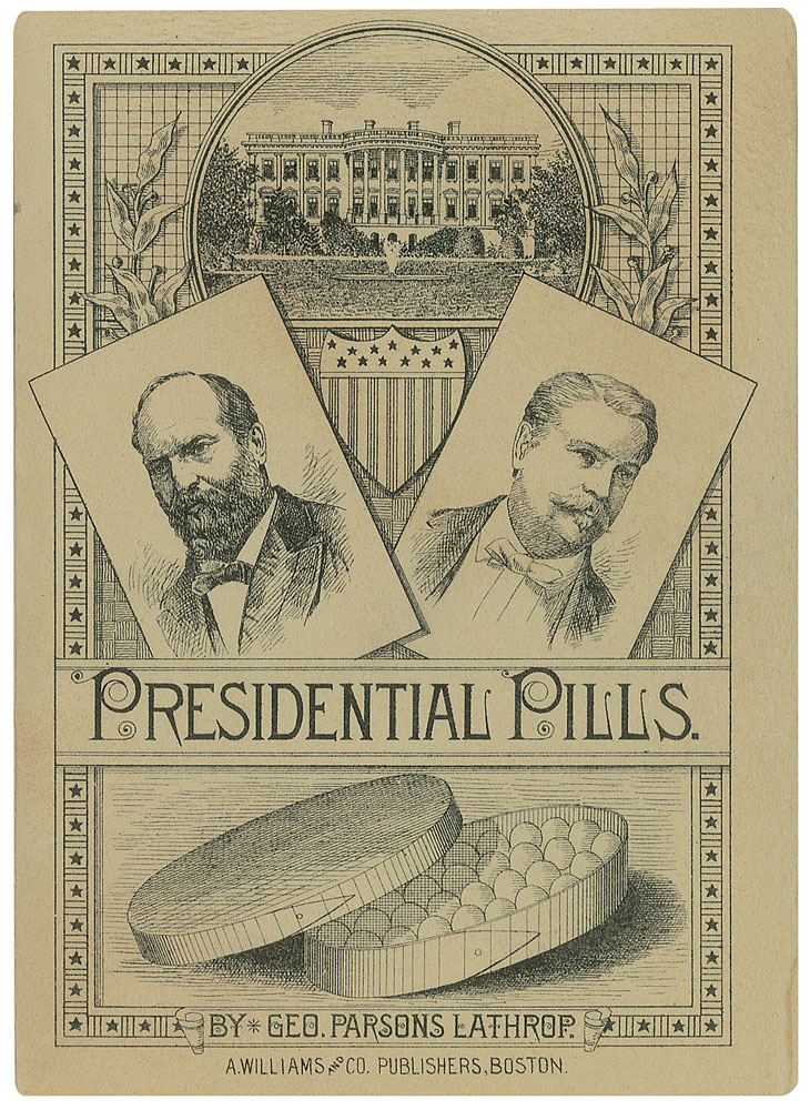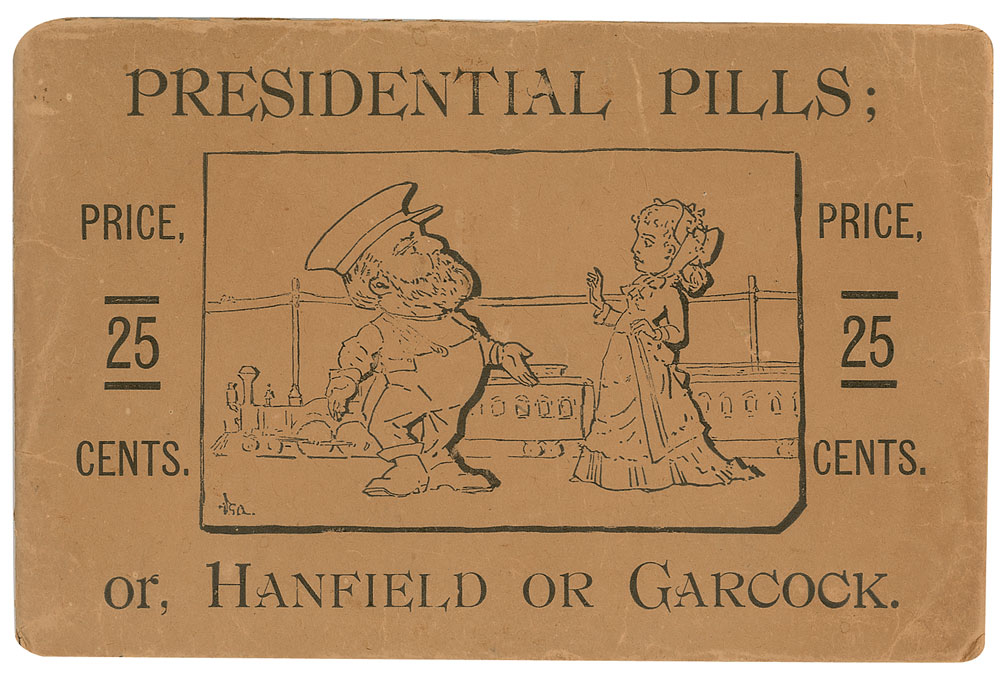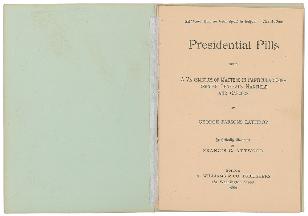 Satirical booklet prepared for the 1880 presidential campaign between James A. Garfield and Winfield Scott Hancock, entitled 'Presidential Pills; or, Hanfield and Garcock,' written by George Parsons Lathrop and "pathetically illustrated" by Francis G. Attwood, published in Boston by A. Williams & Co., 1880. Sections in the booklet include "Hanfield's Moral Purity," "Hanfield's Wedded Life," "Garcock's Beautiful and Touching Stupidity," "Jefferson Gooseberry's Recollections," "The Popularity of Debt," "Garcock and the Tomato," and "Horny-Handed Hanfield at the Lawn-Mower." Includes the sales original envelope, indicating a price of 25 cents. In very good condition, with covers cleanly detached and repaired.