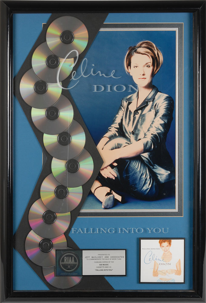 Official serial number hologram-style RIAA multi-platinum sales award presented to commemorate “the sale of more than 10,000,000 copies of the 550 Music cassette and C.D. ‘Falling Into You.’” Expertly framed with its plate, an image of the album cover, and a set of ten CDs denoting platinum sales against a stylized background to an overall size of 22.5 x 33. Award retains its original backing with an Ill-Eagle Enterprises label. In fine condition.