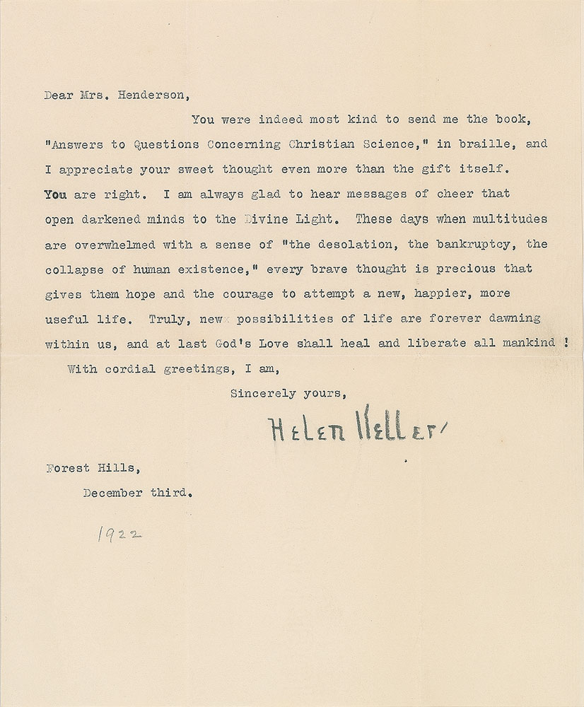 TLS, one page, 7.75 x 9.5, December 3 [1922]. Letter to Mora H. Henderson, in full: “You were indeed most kind to send me the book, ‘Answers to Questions Concerning Christian Science,’ in braille, and I appreciate your sweet thought even more than the gift itself. You are right. I am always glad to hear messages of cheer that open darkened minds to the Divine Light. These days when multitudes are overwhelmed with a sense of ‘the desolation, the bankruptcy, the collapse of human existence,’ every brave thought is precious that gives them hope and the courage to attempt a new, happier, more useful life. Truly, new possibilities of life are forever dawning within us, and at last God’s Love shall heal and liberate all mankind!” In fine condition. Accompanied by the original mailing envelope. Pre-certified PSA/DNA.