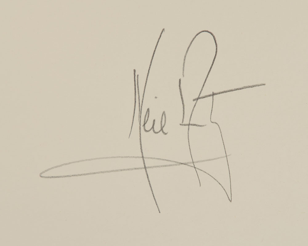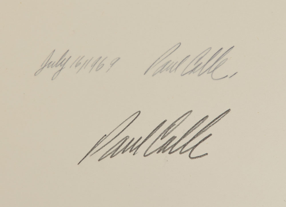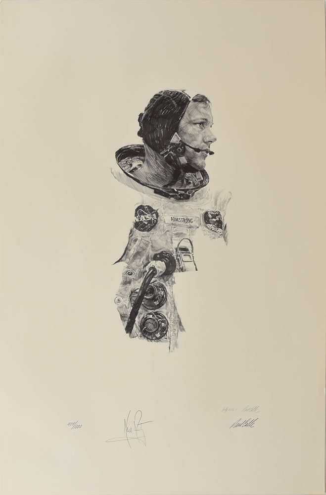 Limited edition 19 x 29 lithograph of Armstrong in his flight suit prior to the Apollo 11 mission, numbered 404/1000, signed in pencil by history’s first moonwalker. Also signed in pencil by the artist, Paul Calle, beneath his preprinted signature. Housed inside a 19.25 x 29.25 presentation folder captioned above, “Neil Armstrong by Paul Calle,” and along the bottom, “National Air and Space Museum for the Charles A. Lindbergh Memorial Fund.” Includes the original mailing box, which bears the Smithsonian National Air and Space Museum label and receipt, dated July 24, 1979. In fine condition. This highly desirable item is the only individual print edition that Armstrong signed and remains among the most sought-after of all NASA-related lithographs.