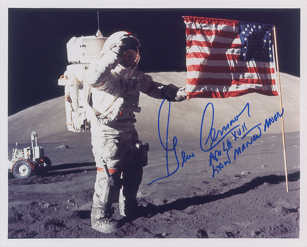 Color semi-glossy 10 x 8 full-length photo of Cernan holding and saluting the American flag on the lunar surface, signed in blue felt tip, “Gene Cernan, Apollo XVII, Last Man on Moon.” In very fine condition. Pre-certified Zarelli Space Authentication.