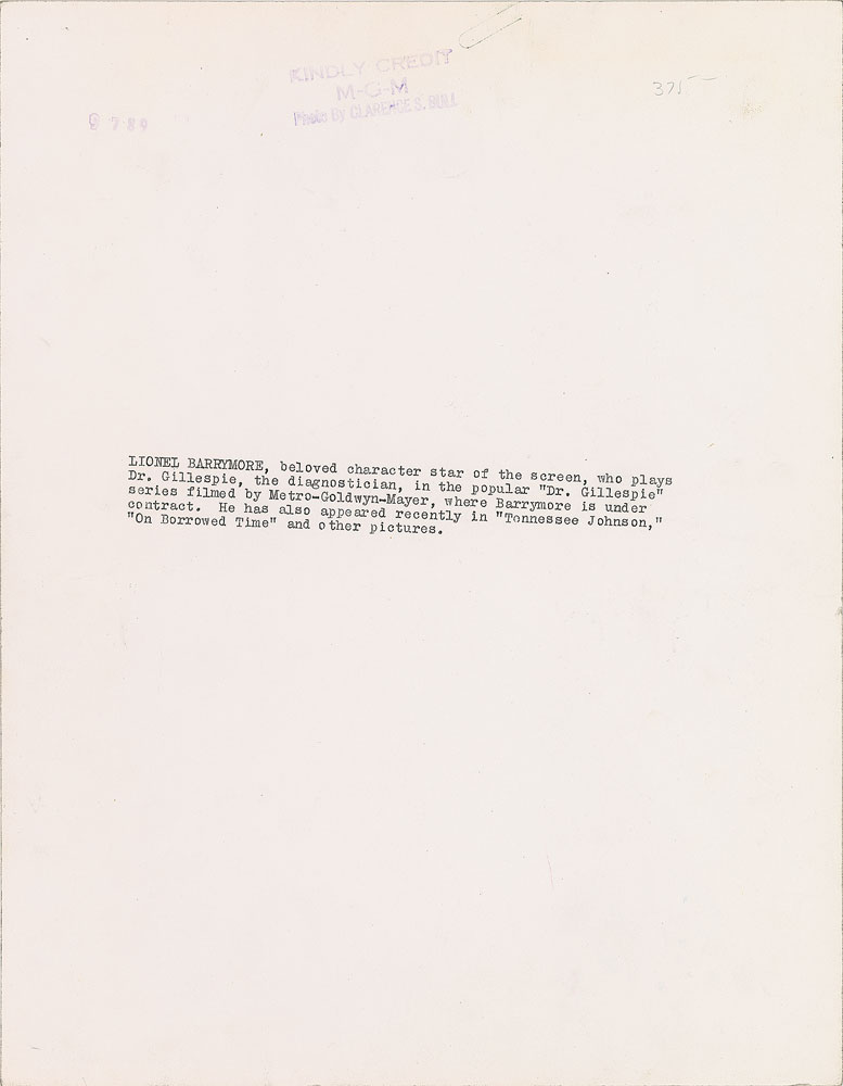 Vintage semi-glossy 10 x 13 MGM publicity portrait of Barrymore by Clarence Sinclair Bull, signed and inscribed in blue ink, “To dear Louella, Sincerely, W. C. Fields? (by Lionel Barrymore).” Reverse bears an MGM-Bull credit stamp, as well as a printed MGM caption for Barrymore. In fine condition. Pre-certified PSA/DNA.