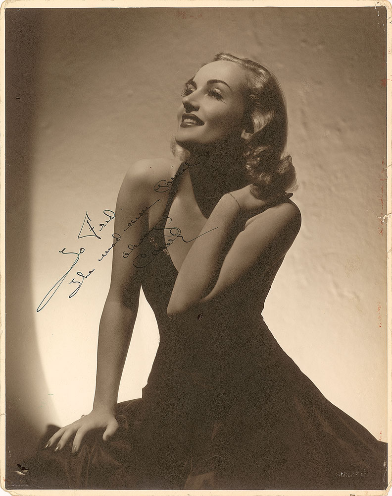 Glamorous vintage matte-finish 11 x 14 Hurrell portrait of Lombard posing with a hand on her shoulder, signed and inscribed in green ink, “To Fred the mad man Parrish, always, Carole.” Lower right corner bears a Hurrell blindstamp. In fine condition, with creases, tears, and chipping confined to edges and corners (repair to right edge with tape on reverse), and some red marks to right edge. The recipient is likely Fred Parrish the MGM still photographer. Pre-certified PSA/DNA.