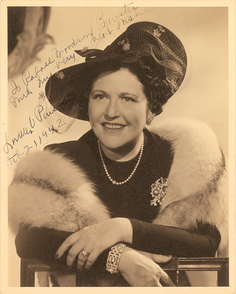America’s first movie columnist (1881–1972) whose columns were read by 20 million people. Vintage matte-finish 8 x 10 photo of Parsons in a fur stole and fancy hat, signed and inscribed in fountain pen, “To Rafael…Brewster, With my very best wishes, Louella Parsons, Feb. 2, 1942.” Reverse bears a Tom Kelley photography stamp. In fine condition, with repaired diagonal tear to lower right. Pre-certified PSA/DNA.