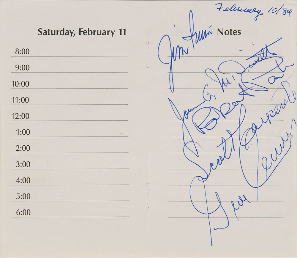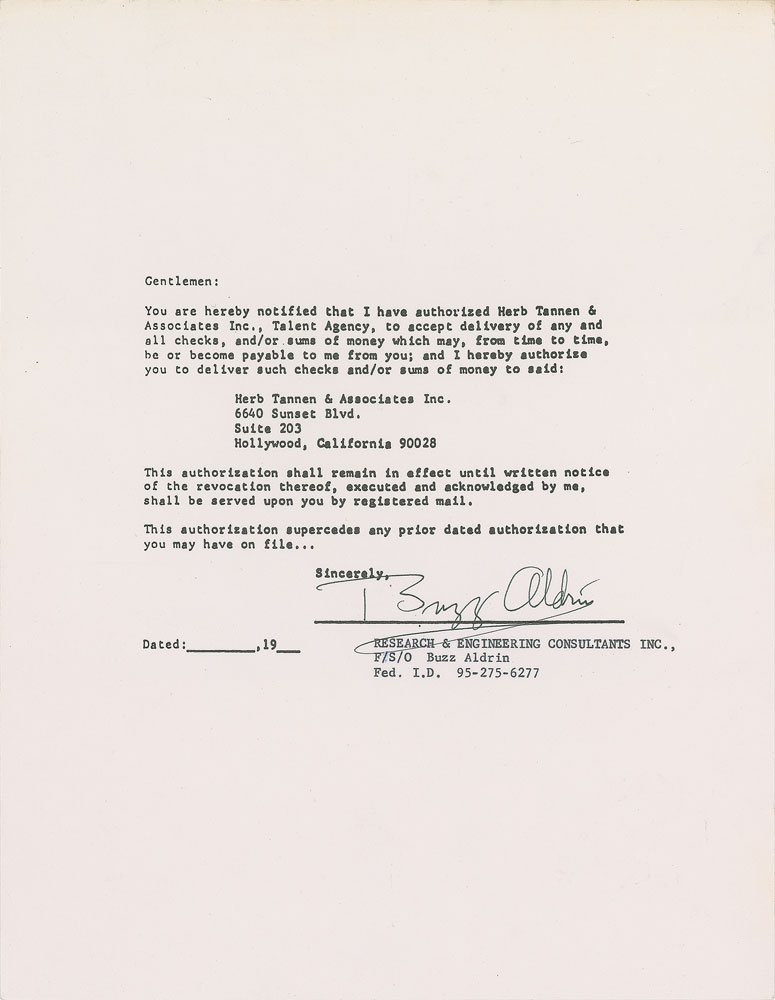 Two items: ballpoint signatures of Jim Irwin, Gene Cernan, Jim McDivitt, Scott Carpenter, and Robert Parker on a 6 x 5 note sheet; and a DS signed by Buzz Aldrin, one page, 8.5 x 11, no date, authorizing "Herb Tannen & Associated, Inc., Talent Agency, to accept delivery of any and all checks...or sums of money which may...become payable to me from you." In overall fine condition.