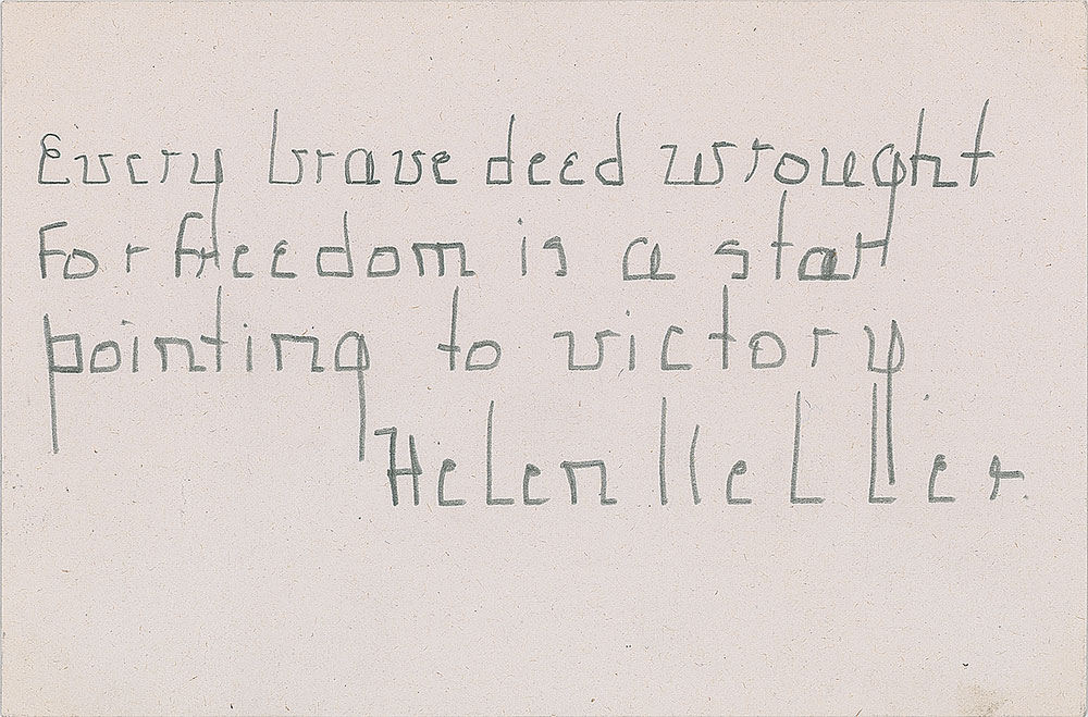 AQS in pencil on an off-white 5.5. x 3.5 card, in full: “Every brave deed wrought for freedom is a star pointing to victory, Helen Keller.” In very fine condition. Pre-certified PSA/DNA.