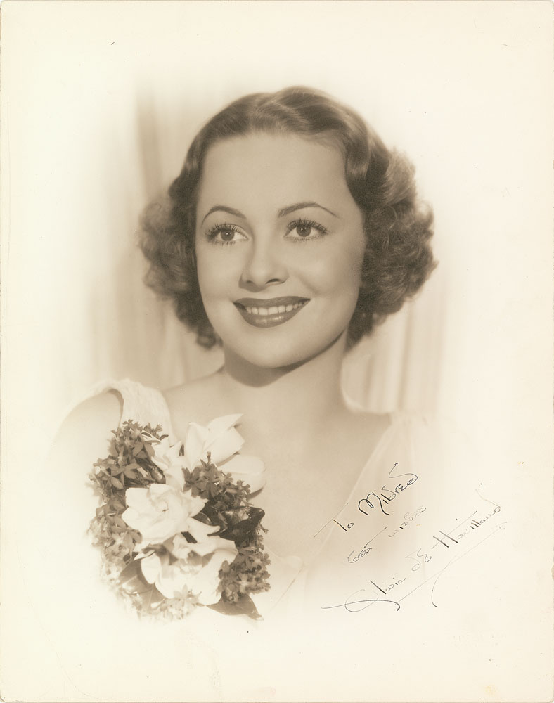 Vintage matte-finish 11 x 14 Elmer Fryer portrait of the stunning actress, signed and inscribed in fountain pen, “To Mildred, best wishes, Olivia de Havilland.” Lower right bears a photography studio blindstamp. In fine condition, with some corner creases, mainly to upper right. Pre-certified PSA/DNA.