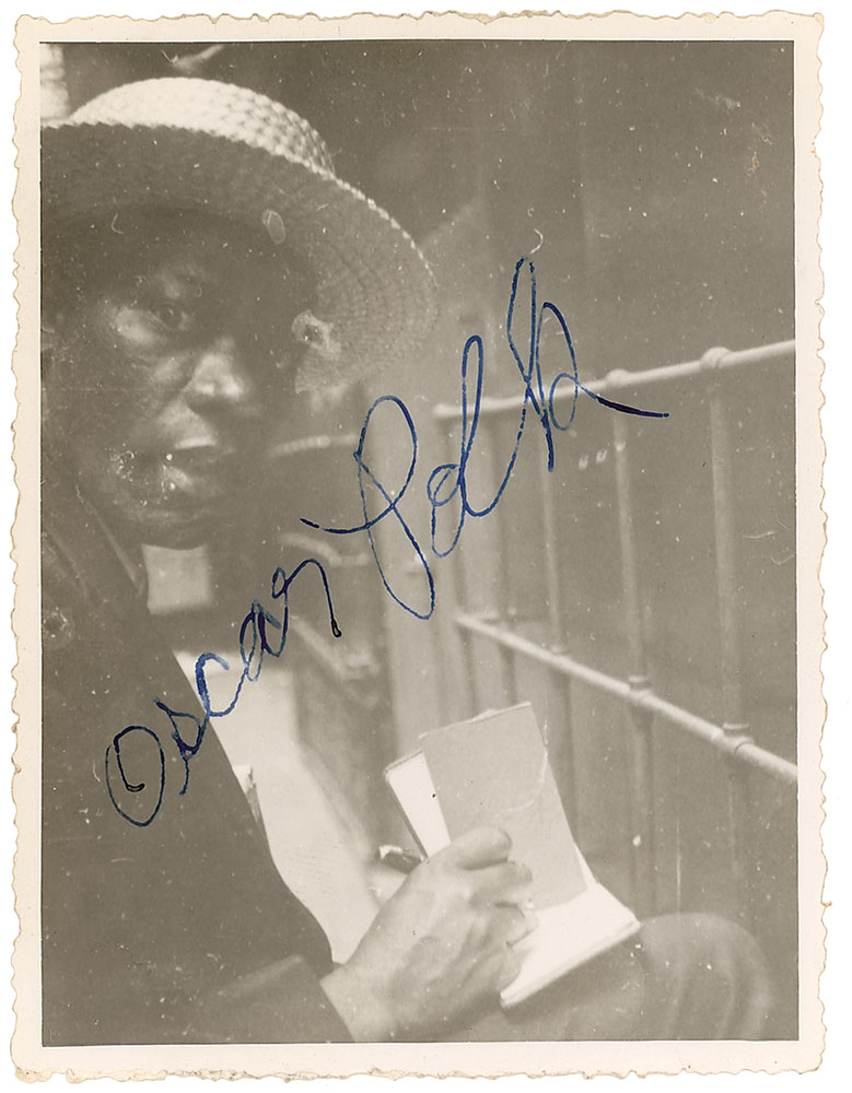 African-American actor (1899–1949) best known for his role as Pork in the classic film Gone With the Wind. Extremely rare vintage glossy 2.75 x 3.75 deckle-edge photo of the actor in a straw hat looking over his right shoulder at the camera as he signs an album, boldly signed in fountain pen, “Oscar Polk.” A few very minor surface marks and small flaws inherent to original negative, otherwise fine condition. Consignor notes that the photo was originally contained in an album on a page indicating that it was obtained during Polk’s engagement in the 1941 play Mr. Big. Given his limitations as an African-American actor and his death at the age of 49, items signed by Polk are among the most elusive and sought-after for Gone With the Wind enthusiasts. Pre-certified PSA/DNA.