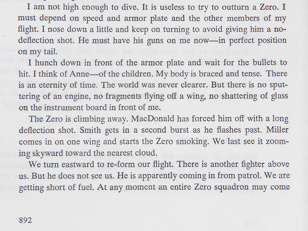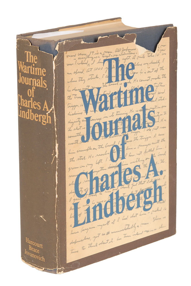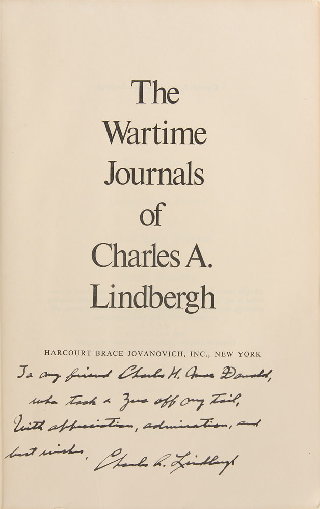 Signed book: The Wartime Journals of Charles A. Lindbergh. Later printing. NY: Harcourt Brace Jovanovich, 1970. Hardcover with dust jacket, 6.5 x 9.5, 1038 pages. Signed and inscribed on the title page in fountain pen, “To my friend Charles H. MacDonald, who took a Zero off my tail, With appreciation, admiration, and best wishes, Charles A. Lindbergh.” Autographic condition: fine. Book condition: VG/VG-.