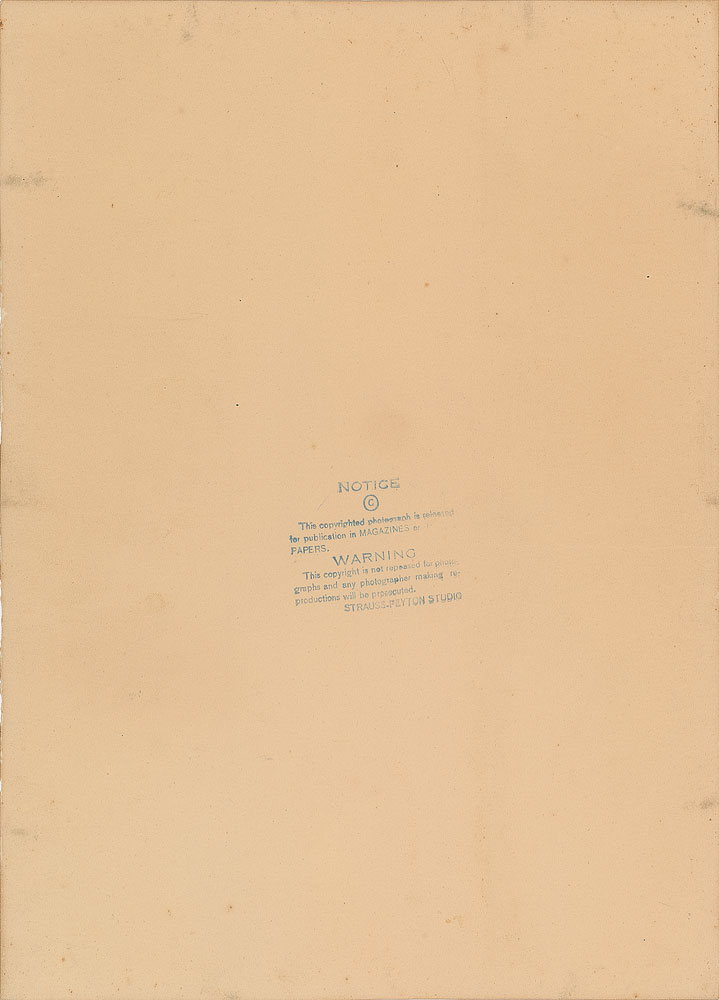 Versatile American comedic actor and writer (1880–1946) who, despite often playing a misanthropic and hard-drinking egotist, remained a popular and sympathetic character. Vintage sepia matte-finish 10 x 13.75 three-quarter-length portrait of Fields by Strauss–Peyton, signed and inscribed in fountain pen, “To my friend Bill Kurth, from his friend, Bill Fields, Nov. 21—1919.” Reverse bears a Strauss–Peyton copyright stamp. In very good condition, with trimmed edges, scattered soiling, a light crease from the left edge to Fields’ chest, and areas of silvering to central portion of image and the lower edge. Pre-certified PSA/DNA.
