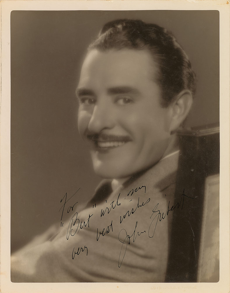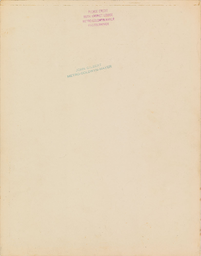 Vintage glossy 11 x 14 MGM publicity portrait of Gilbert by Ruth Harriet Louise, signed and inscribed in dark fountain pen, “For ‘Bert’ with my very best wishes, John Gilbert.” Lower right corner bears a Louise blindstamp, with two MGM stamps on reverse. In very good to fine condition, with scattered overall creasing. Pre-certified PSA/DNA.