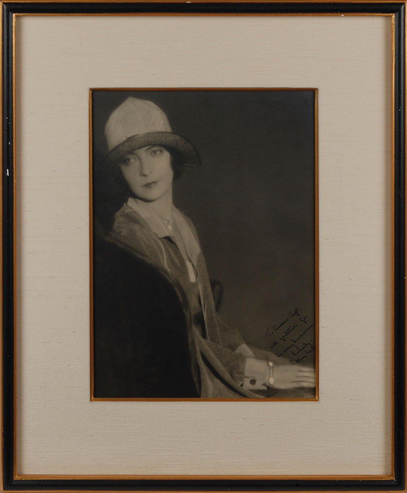 Vintage matte-finish 9 x 12 photo of Gish with her hands softly folded in her lap, boldly signed and inscribed in fountain pen, “To Andrew Hoff, with gratitude for his many kindnesses, Sincerely, Lillian Gish.” Cloth-matted and framed to an overall size of 16.5 x 19.5. In fine condition. Pre-certified PSA/DNA.